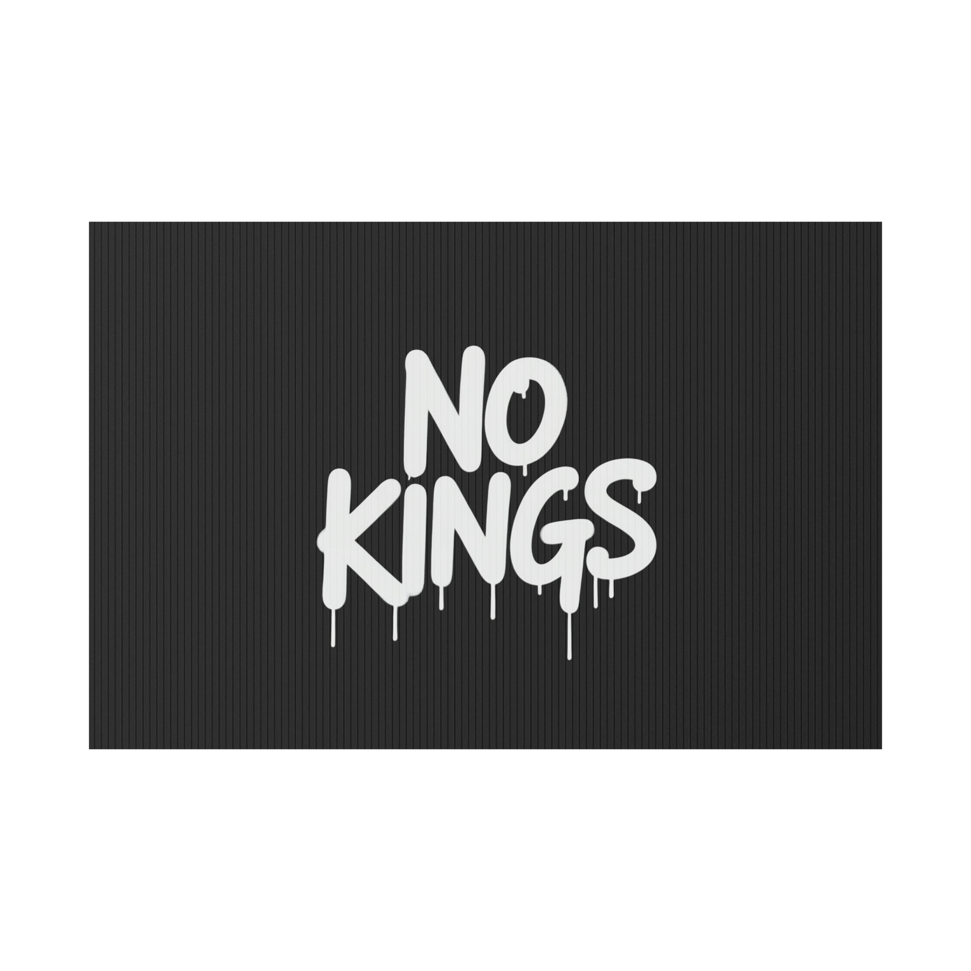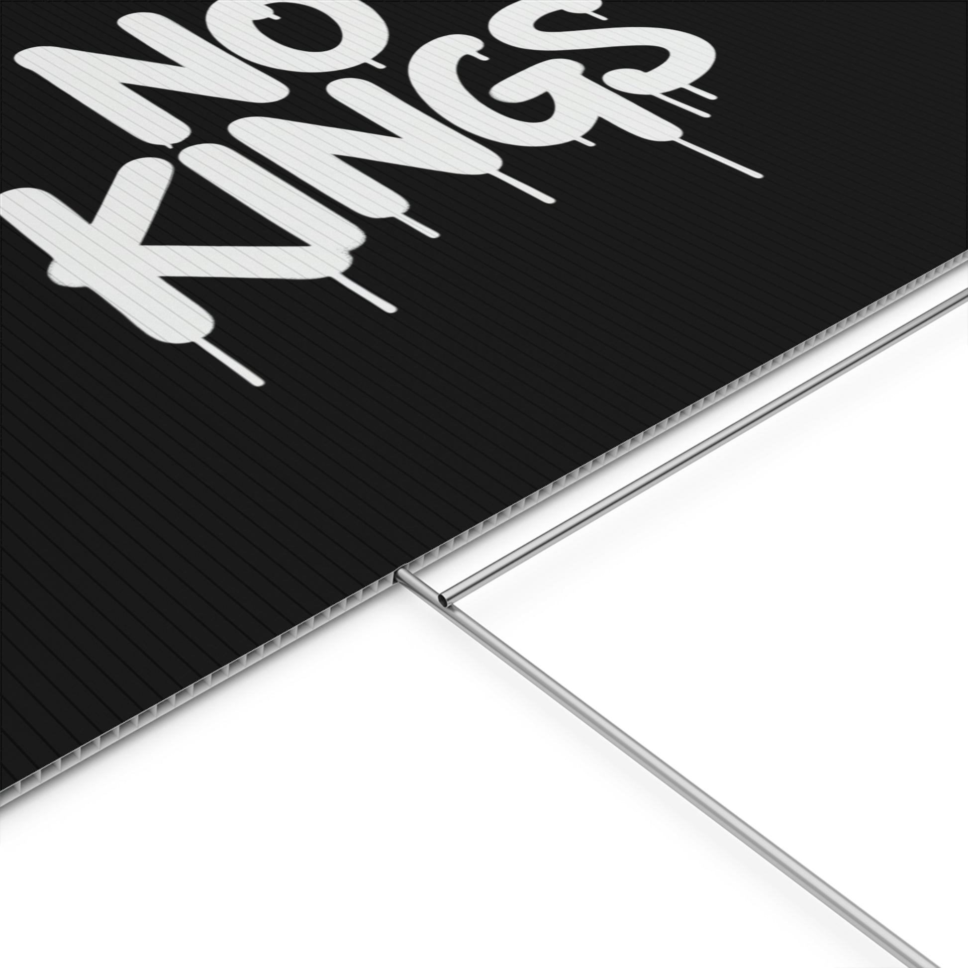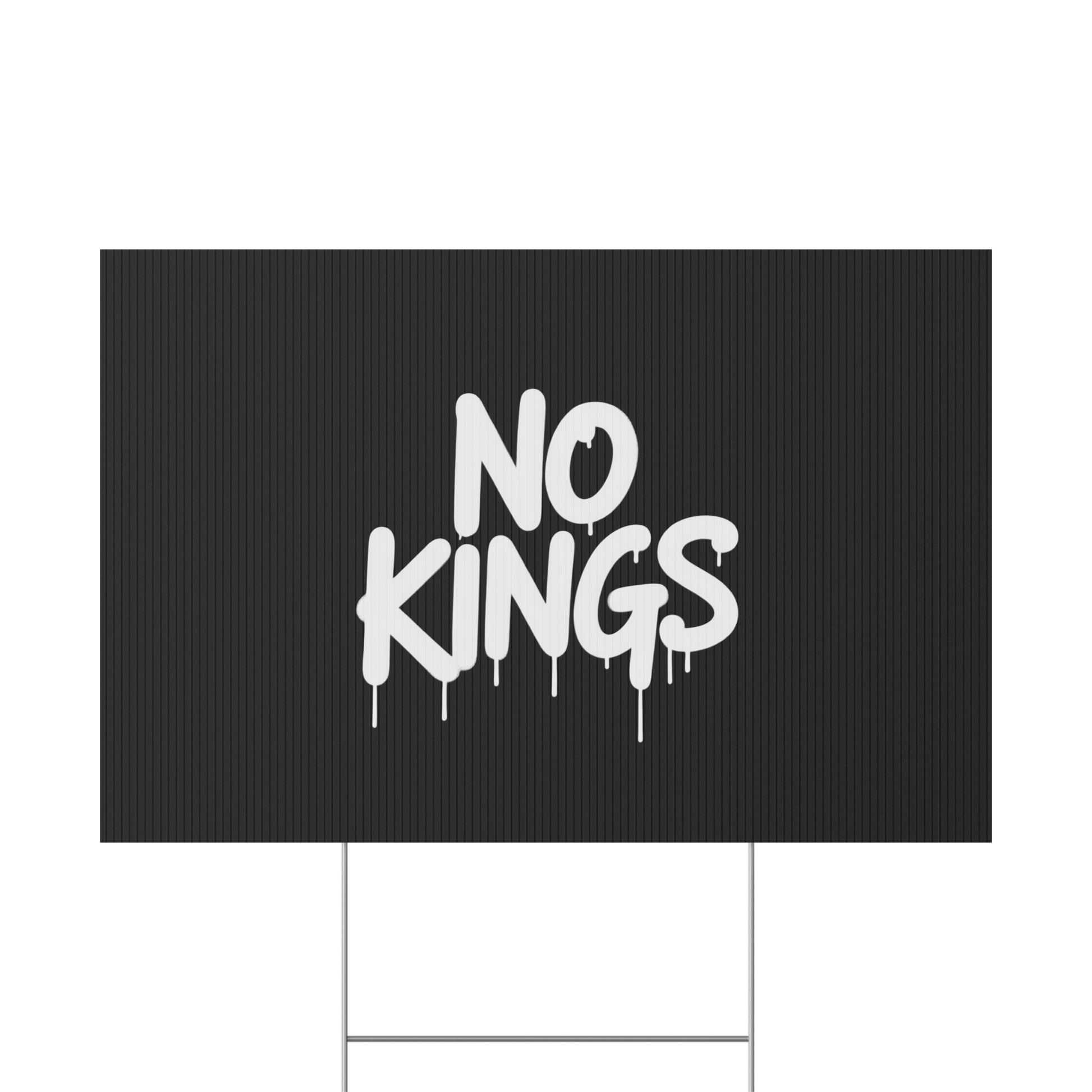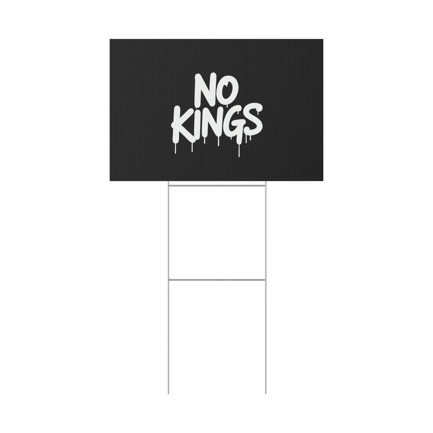 A protest yard sign with a spray painted 'No Kings' design, perfect for making a statement in your outdoor space. Ideal for activists, protestors, and those passionate about social issues. Relevant for protests, demonstrations, and political awareness campaigns.