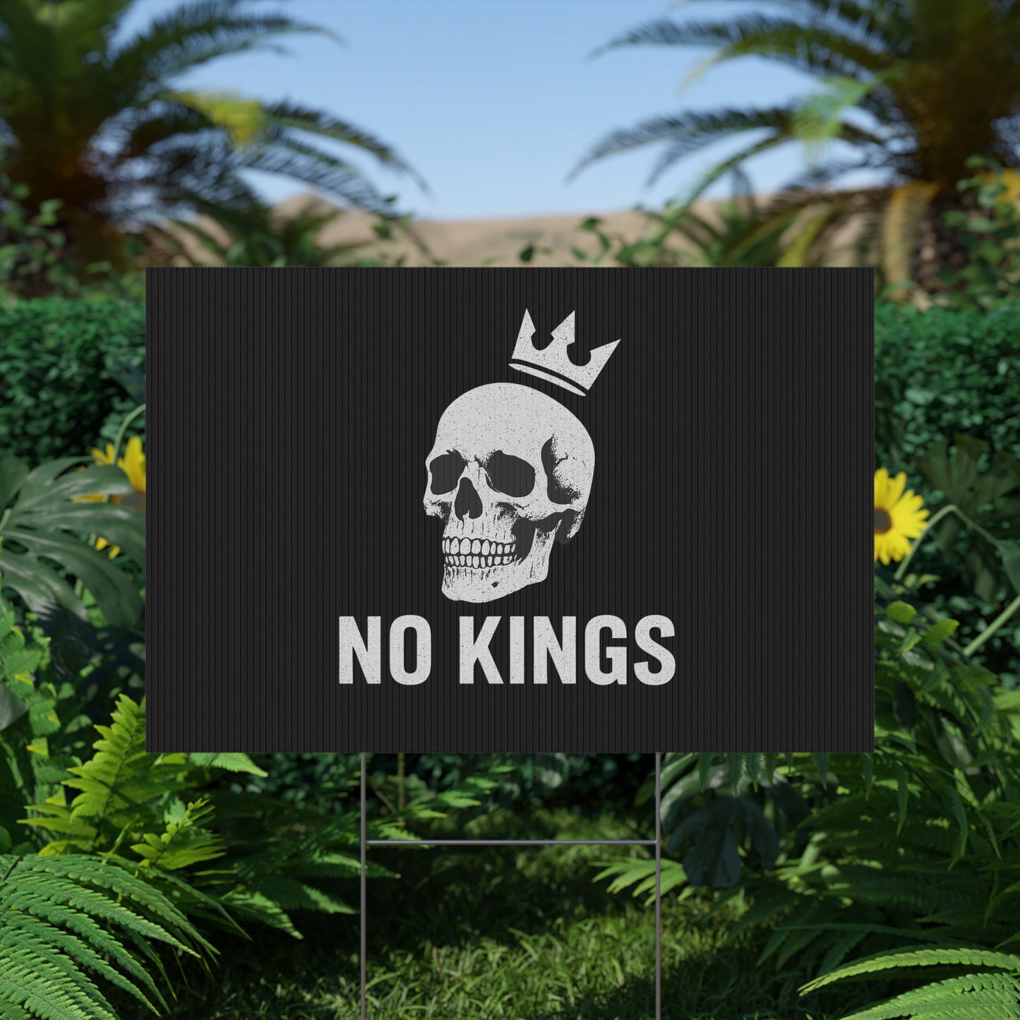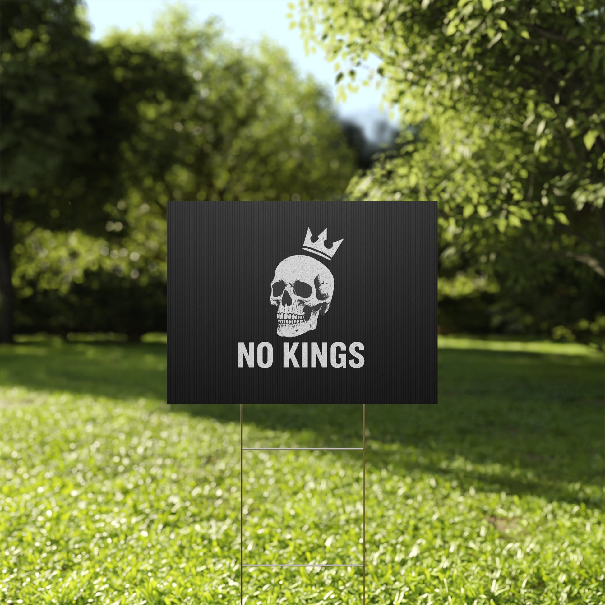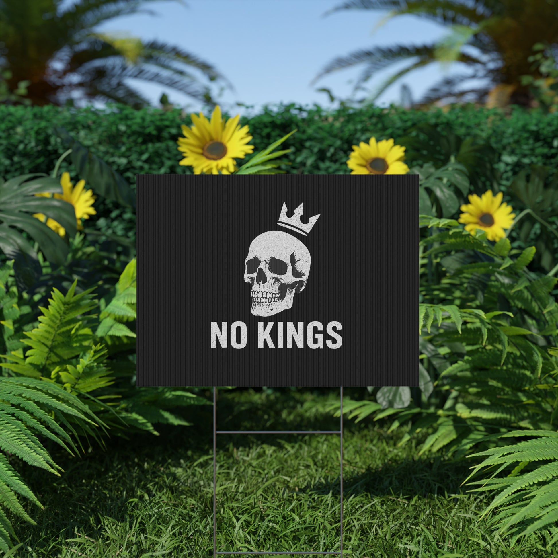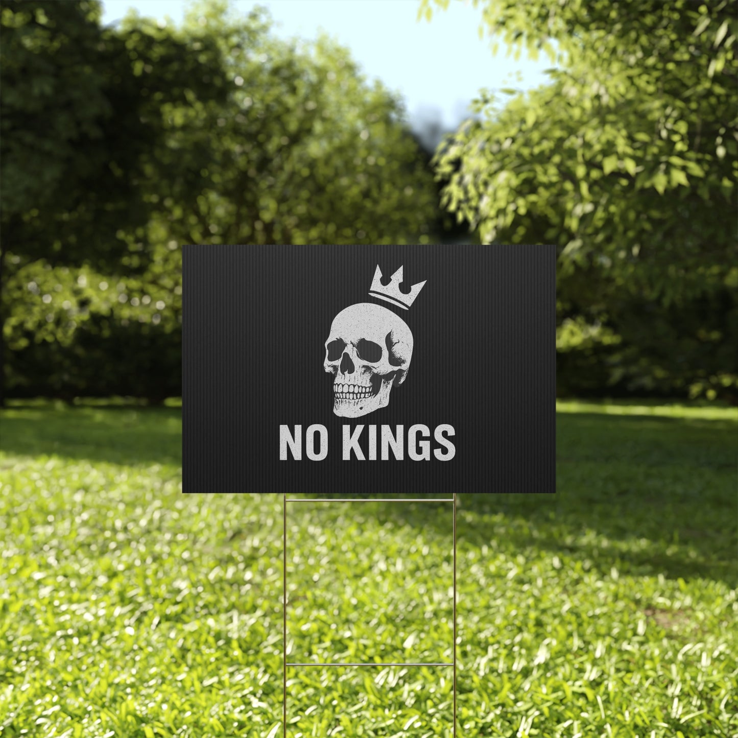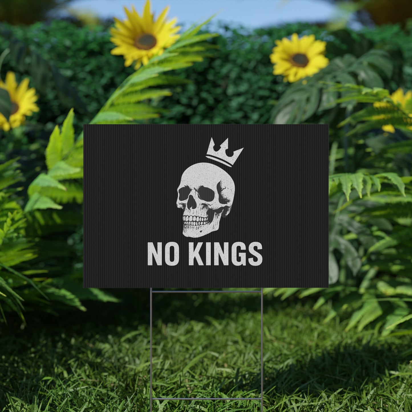 No Kings yard sign, perfect for outdoor use, adds a touch of personality to your garden or lawn. Ideal for those who want to make a statement with their outdoor decor, relevant for birthdays, celebrations, graduations, and holidays.