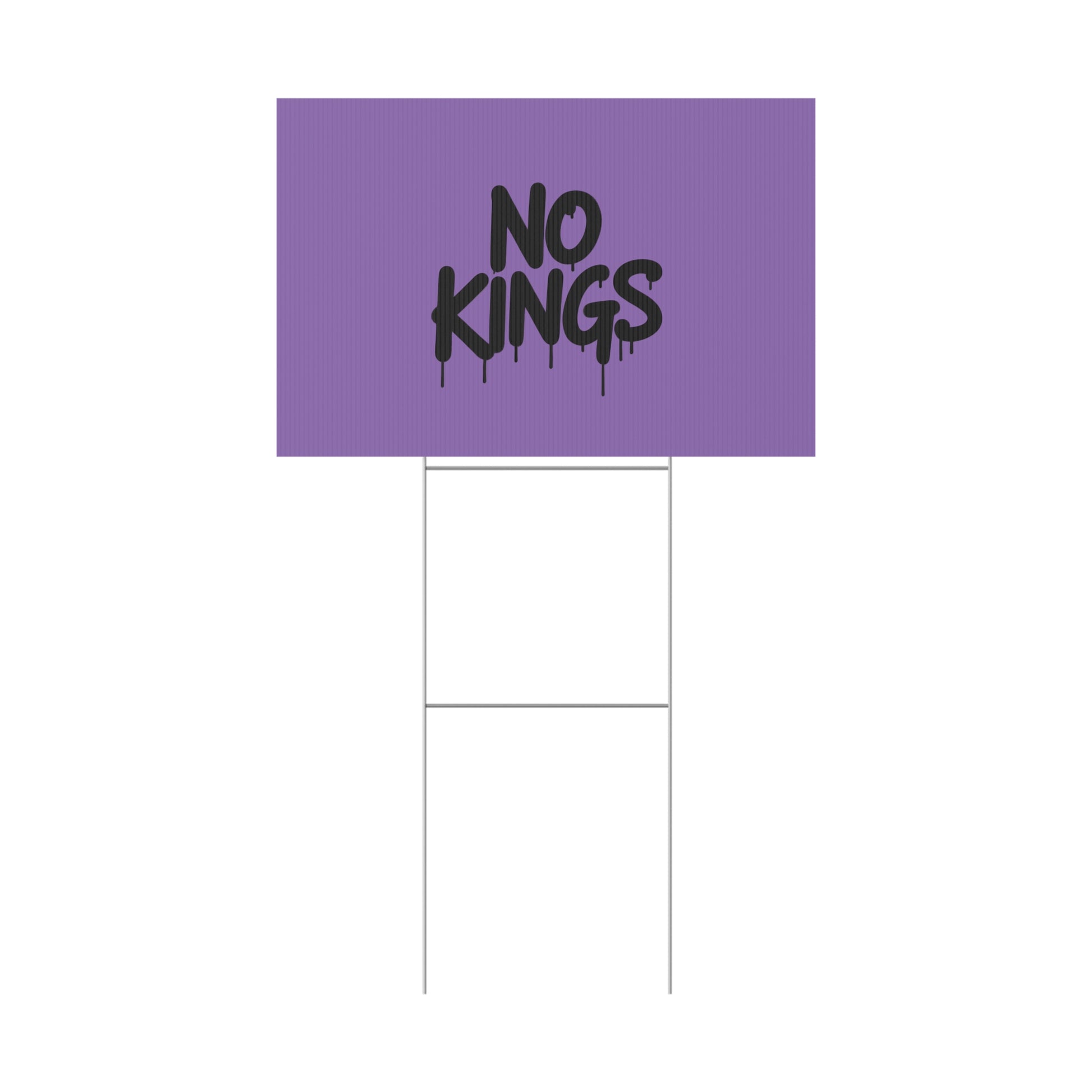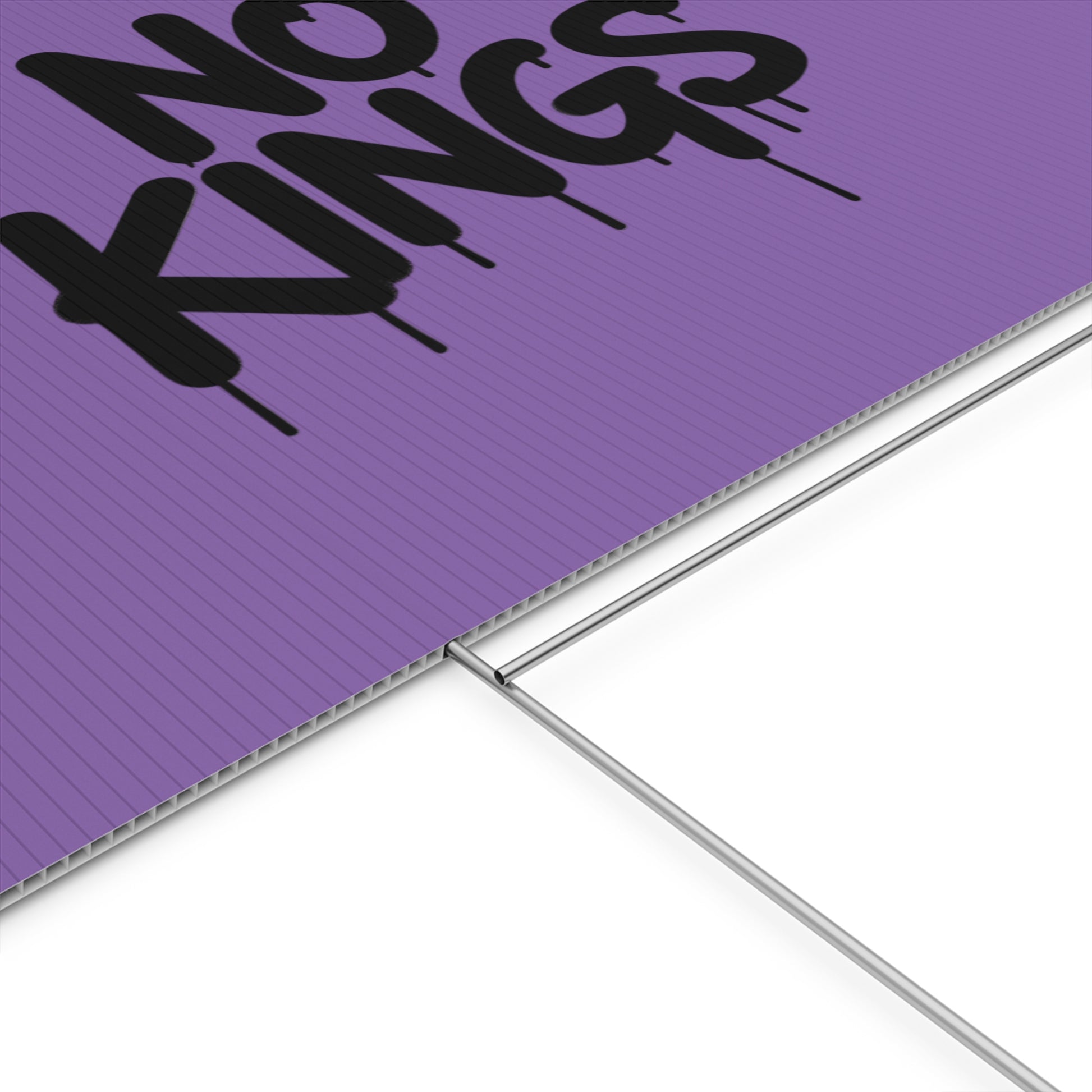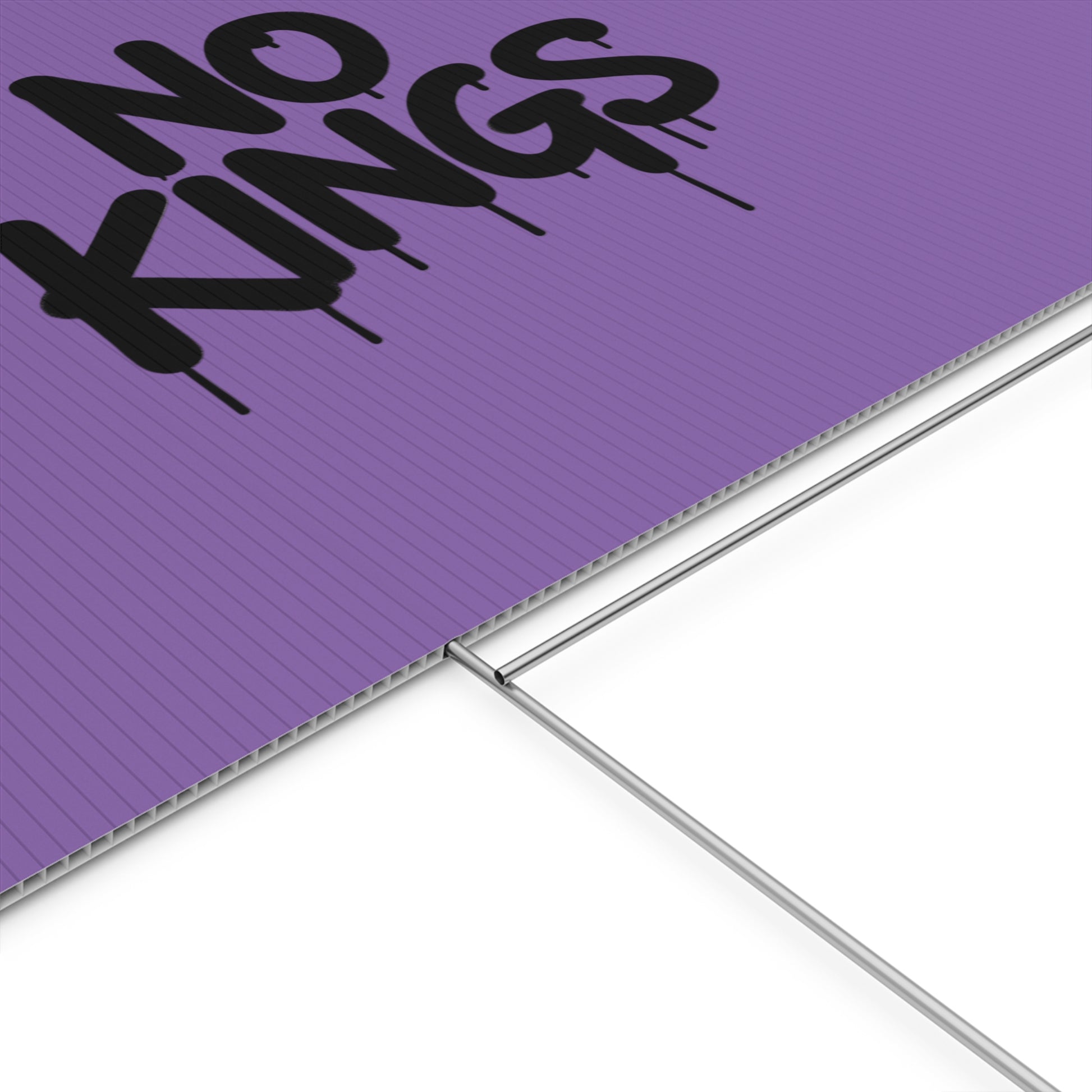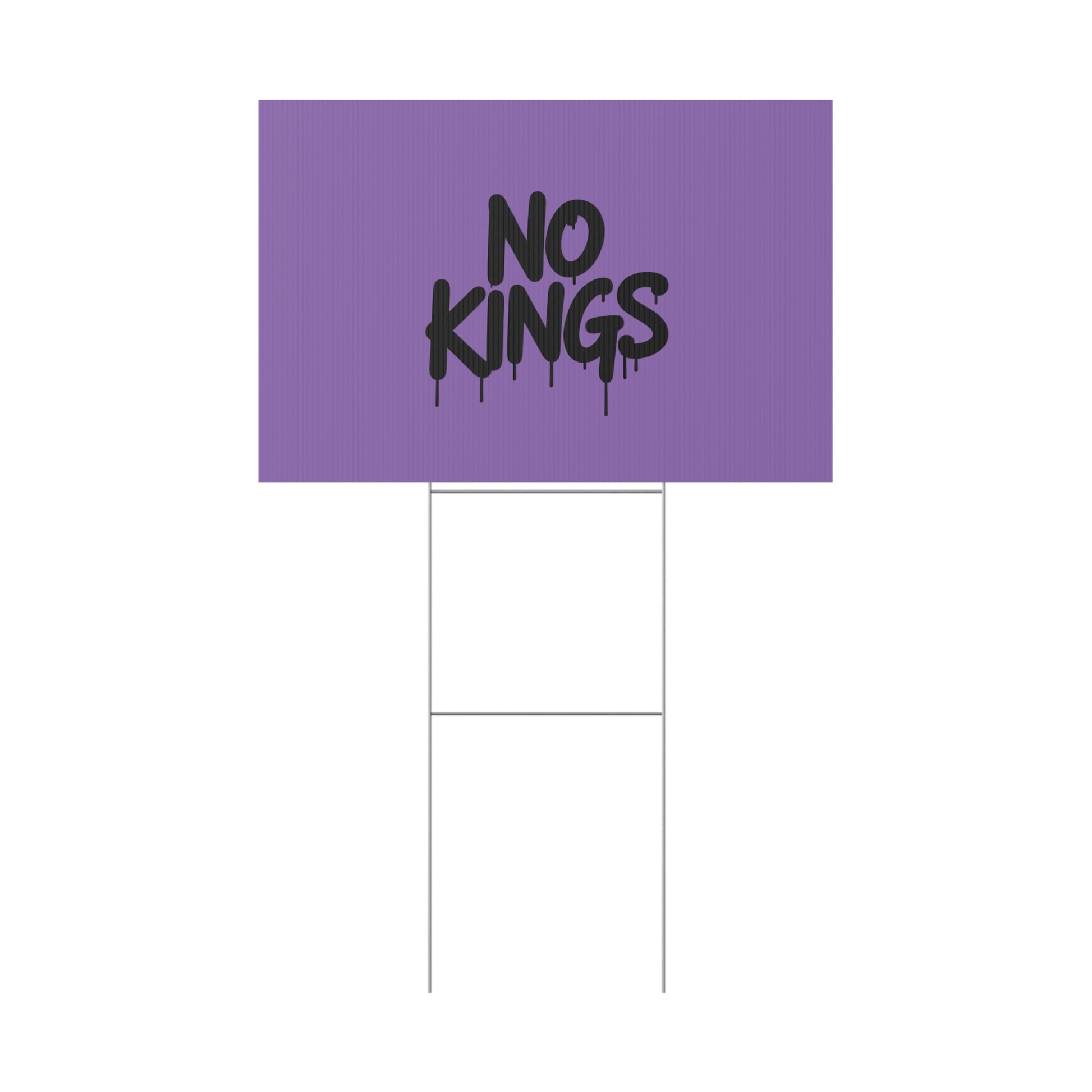 A protest yard sign with a spray painted 'No Kings' design, perfect for making a statement in your outdoor space. Ideal for activists, protestors, and those passionate about social issues. Relevant for protests, demonstrations, and political awareness campaigns.