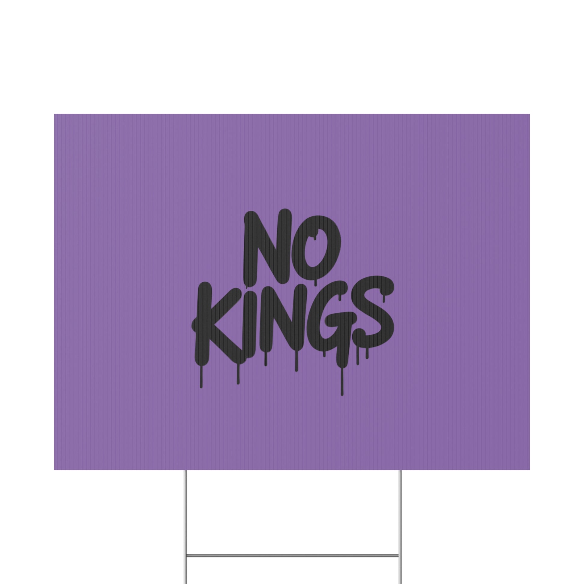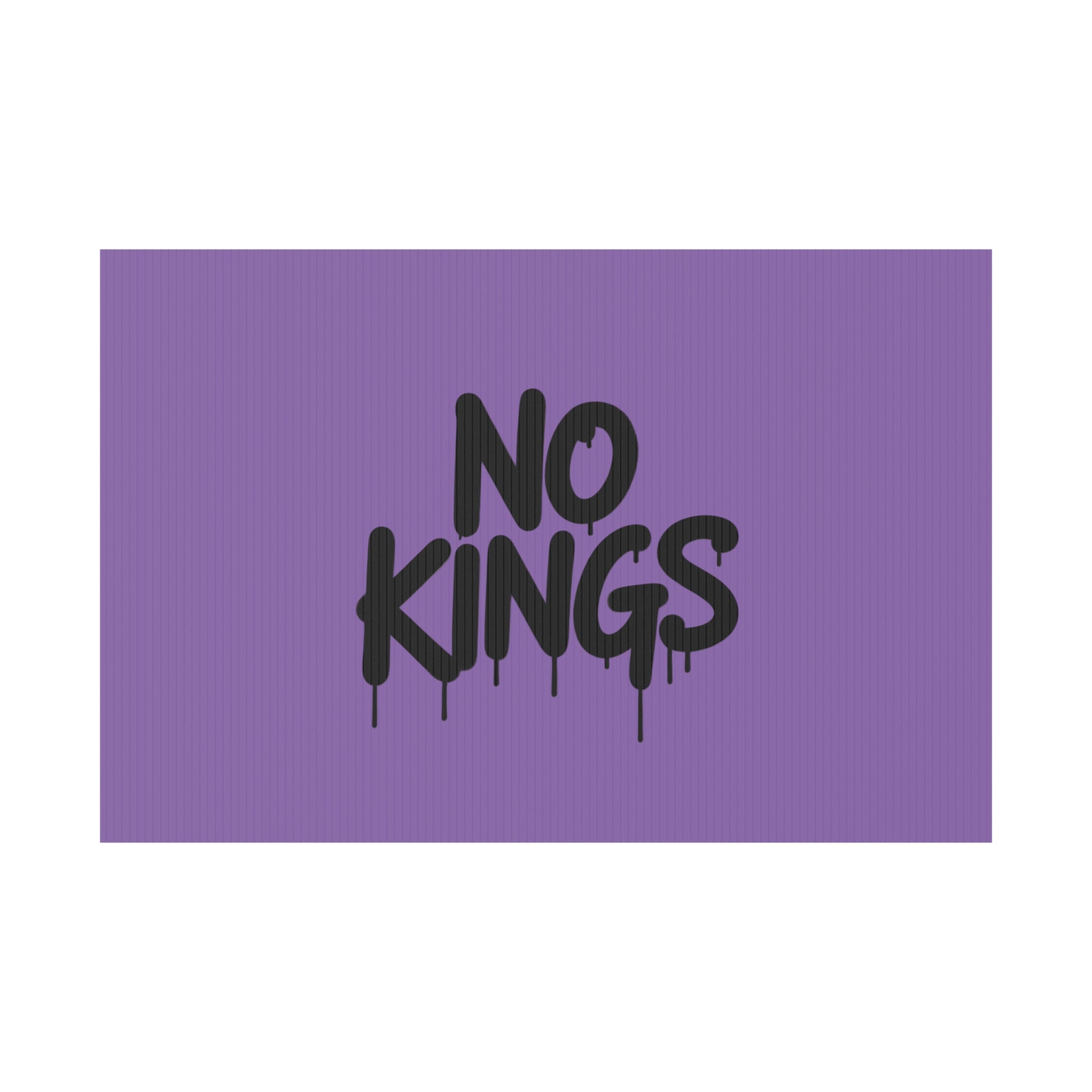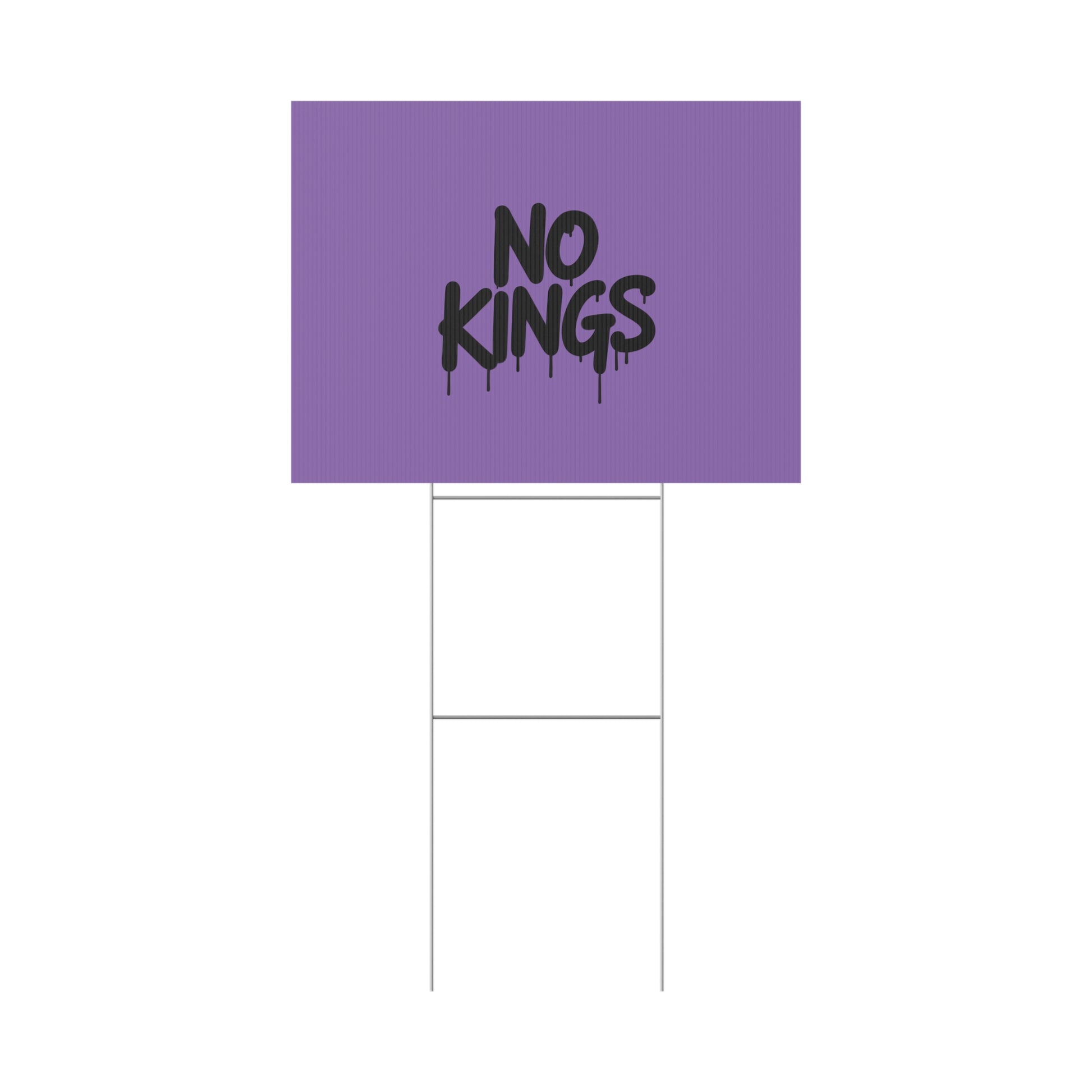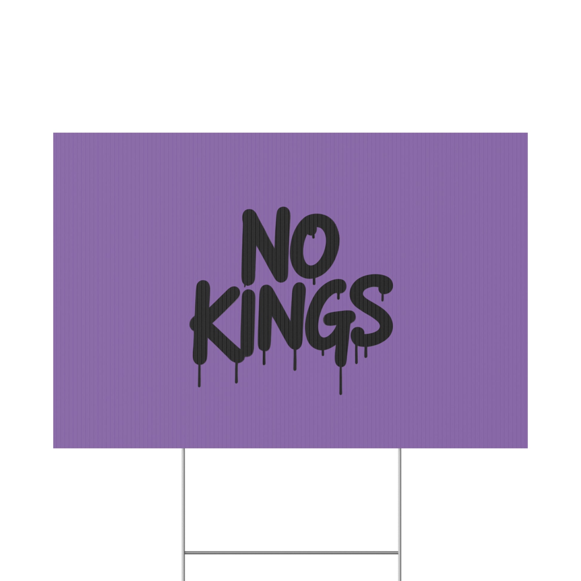 A protest yard sign with a spray painted 'No Kings' design, perfect for making a statement in your outdoor space. Ideal for activists, protestors, and those passionate about social issues. Relevant for protests, demonstrations, and political awareness campaigns.