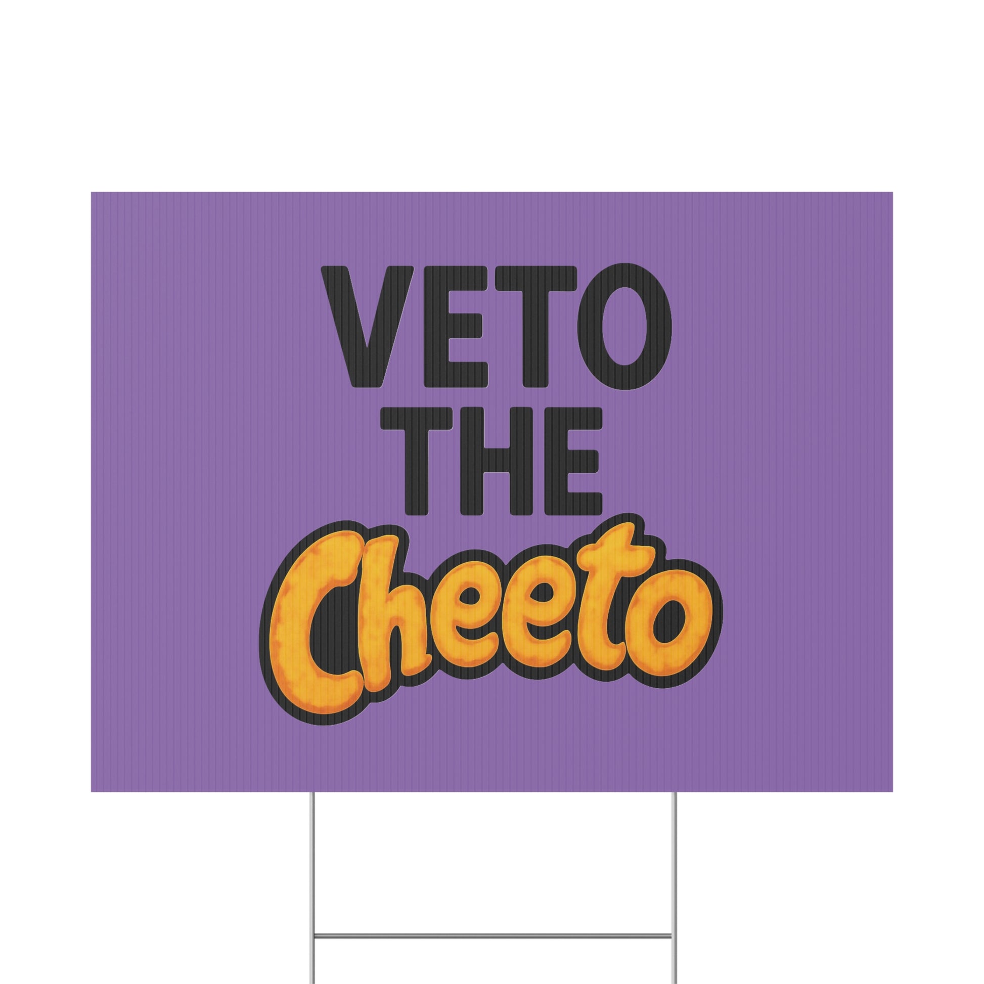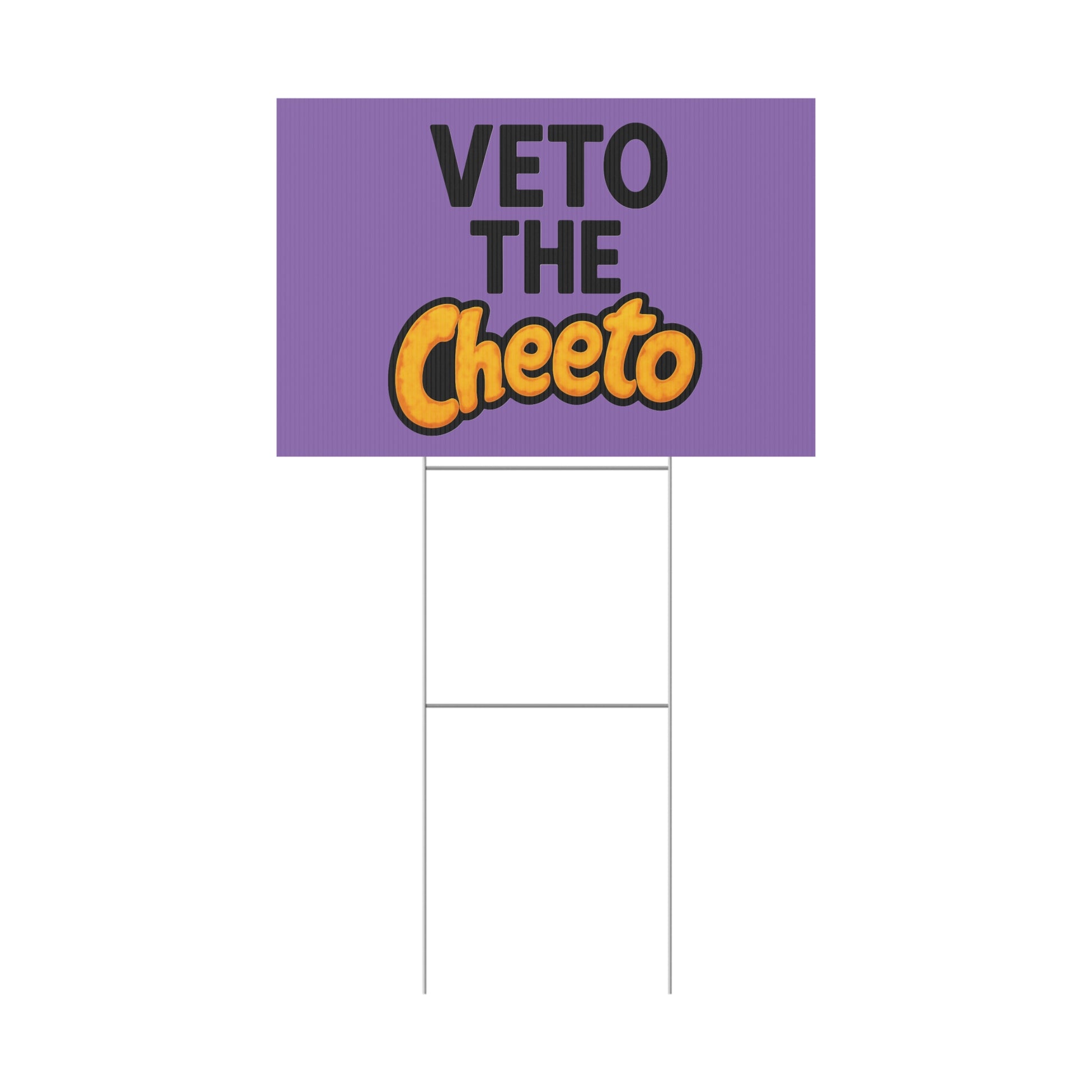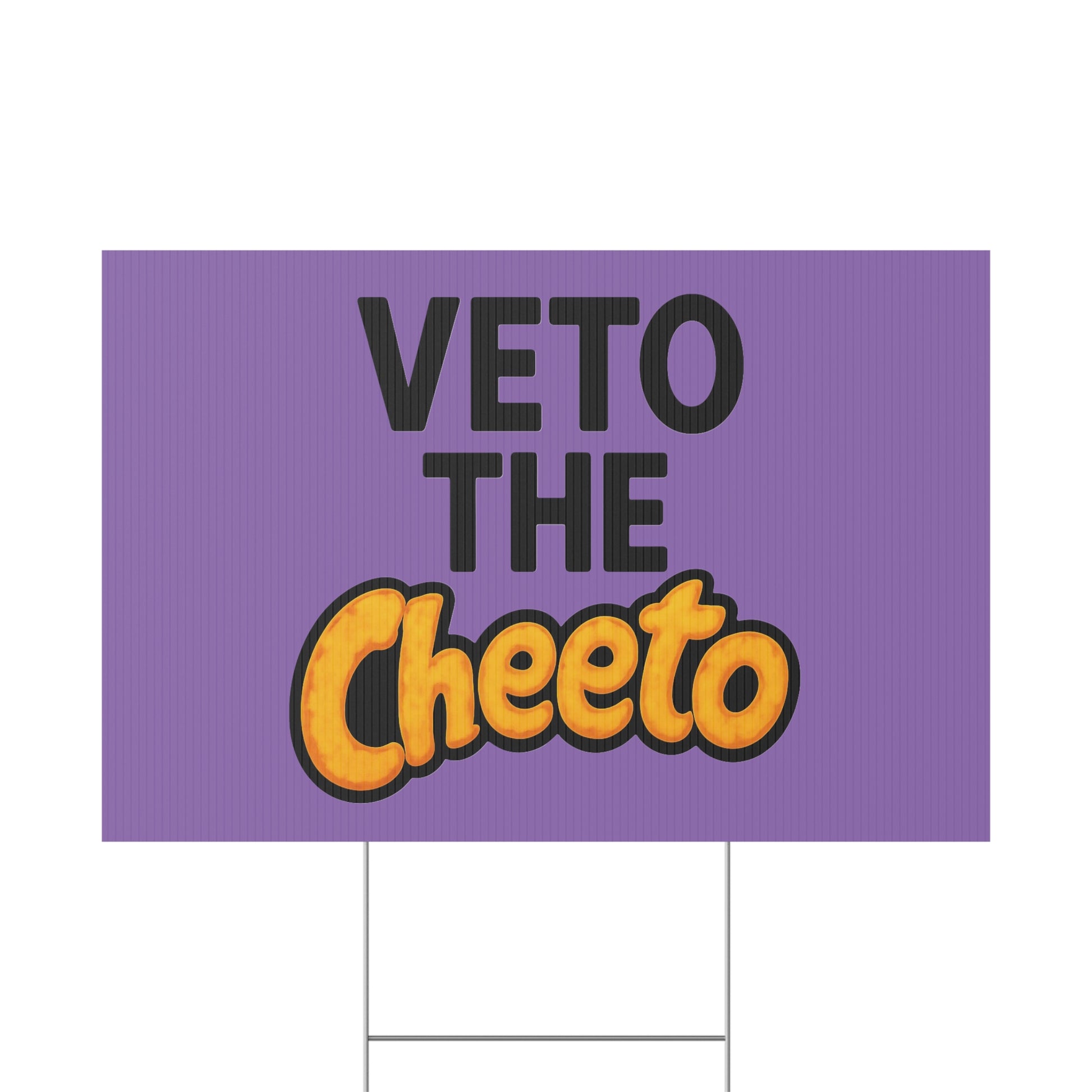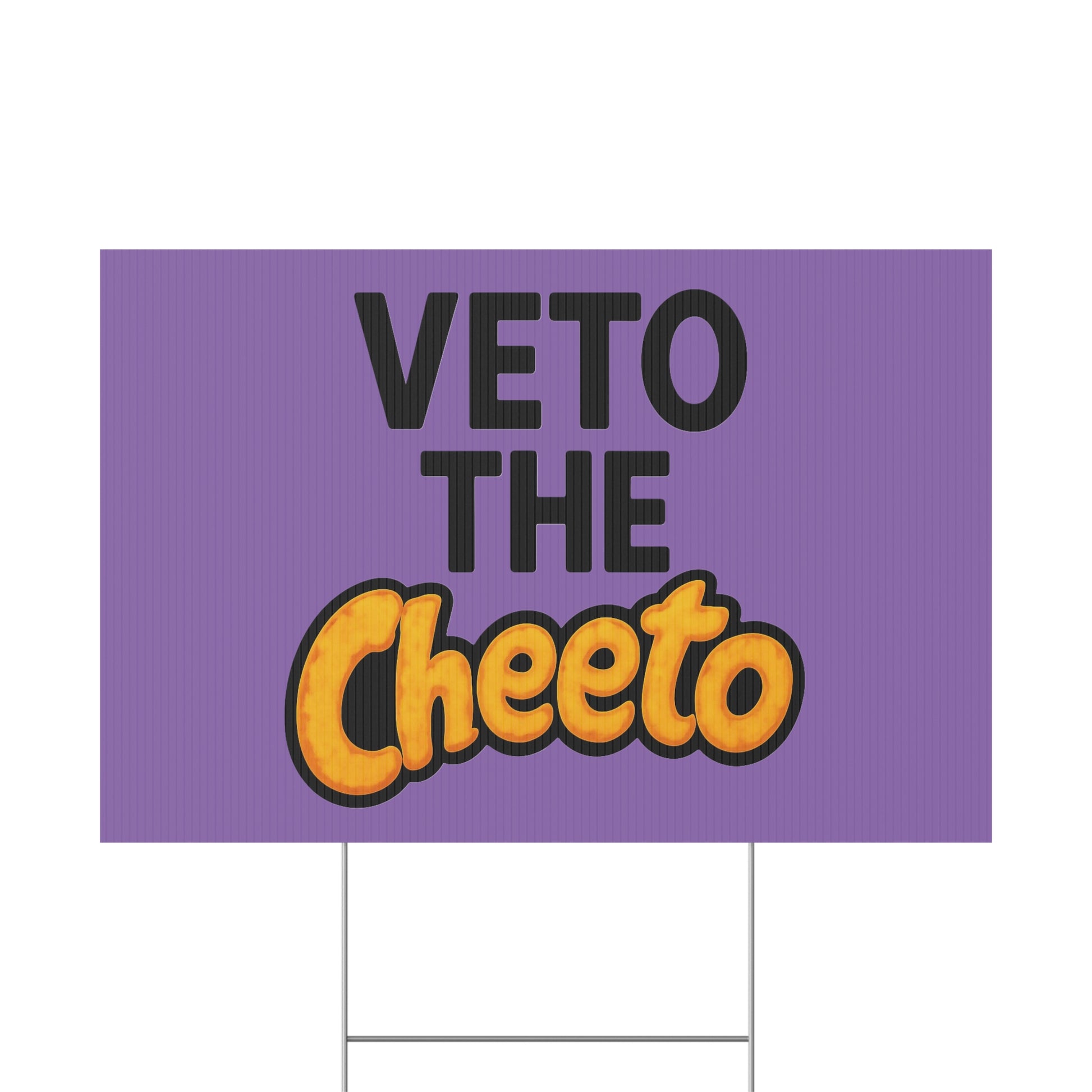 Make a statement in your yard with this Veto the Cheeto yard sign. Perfect for outdoor use, this durable plastic sign comes with an aluminum stake for stability. Show your personality and beliefs with this bold design, perfect for those who want to make a statement during elections, protests, or political gatherings.