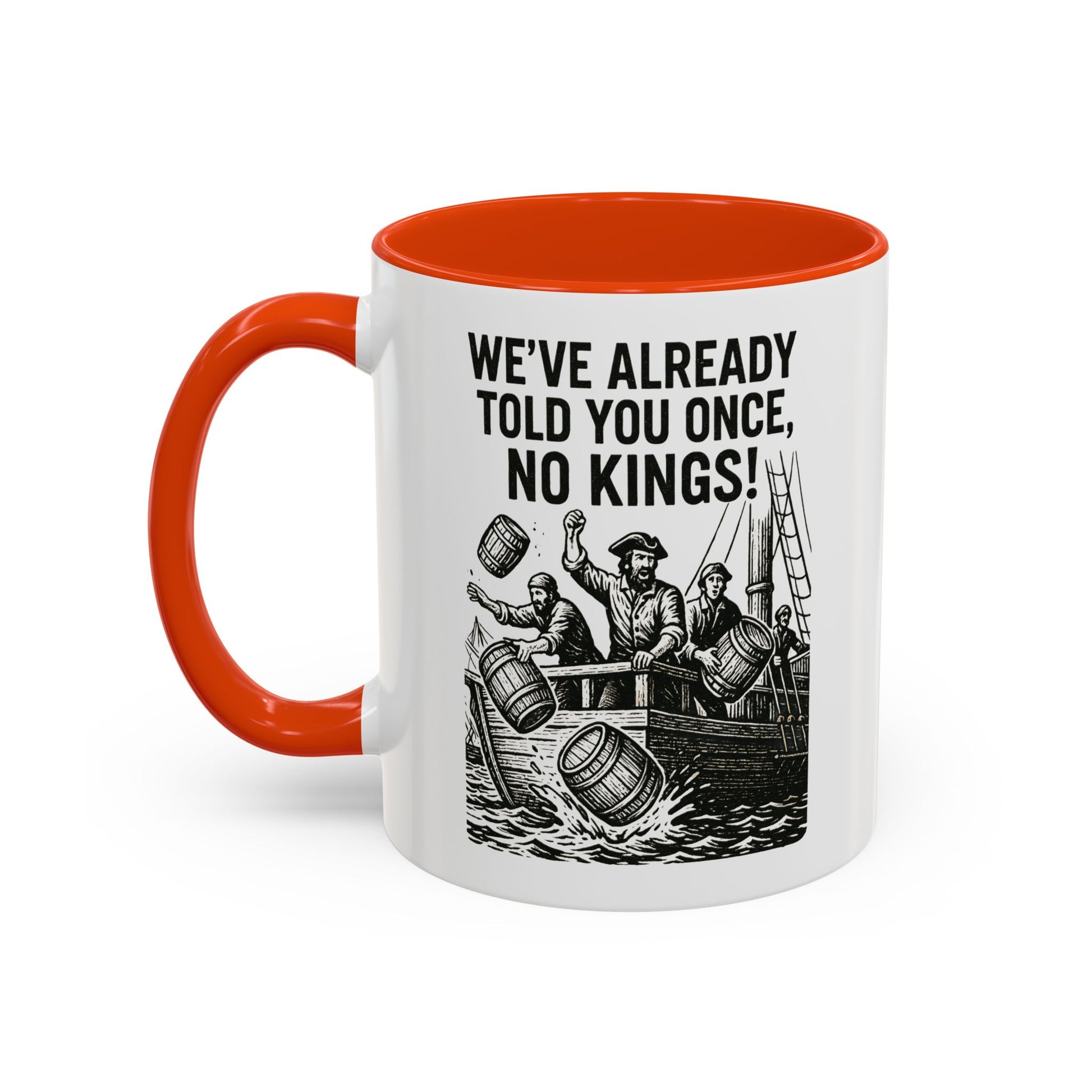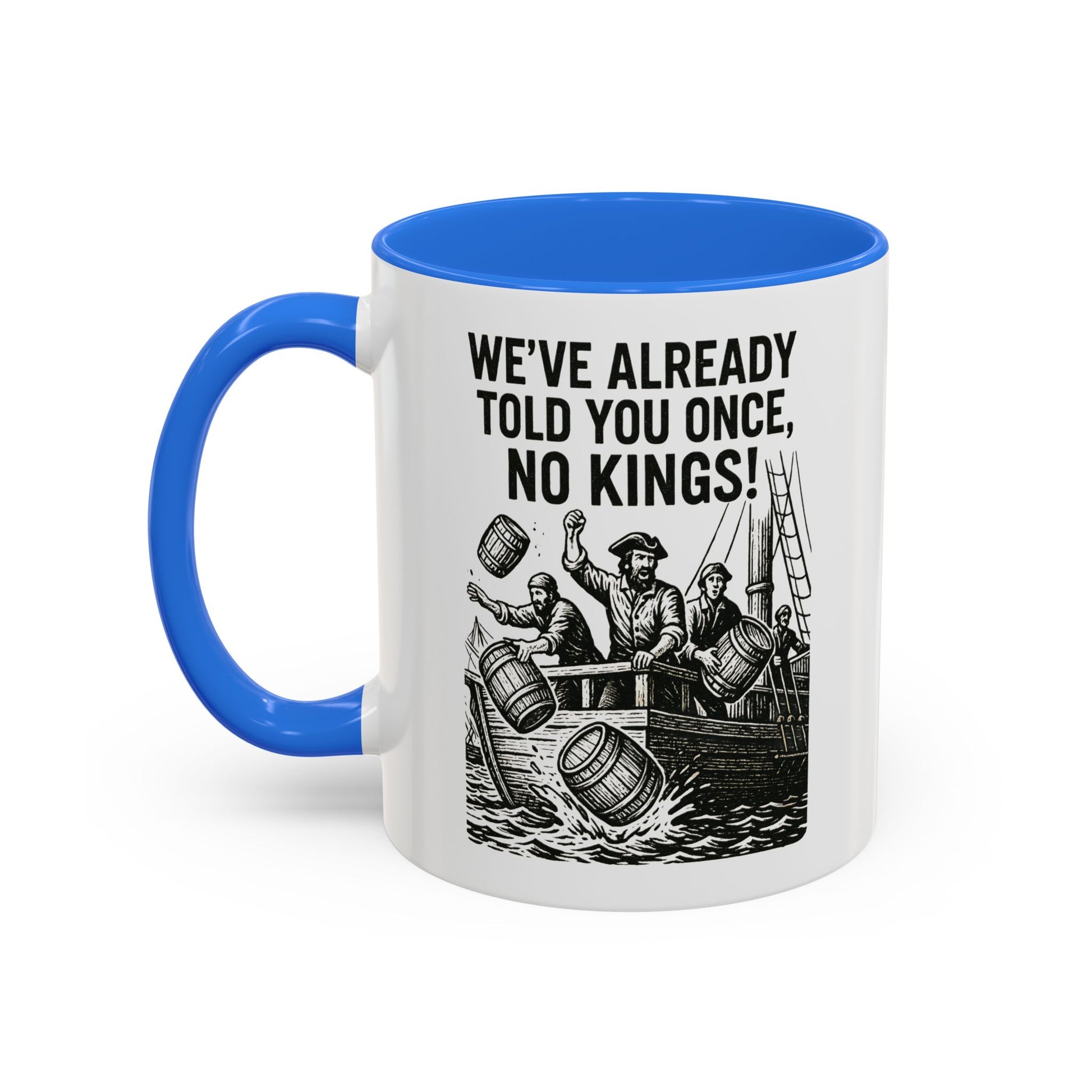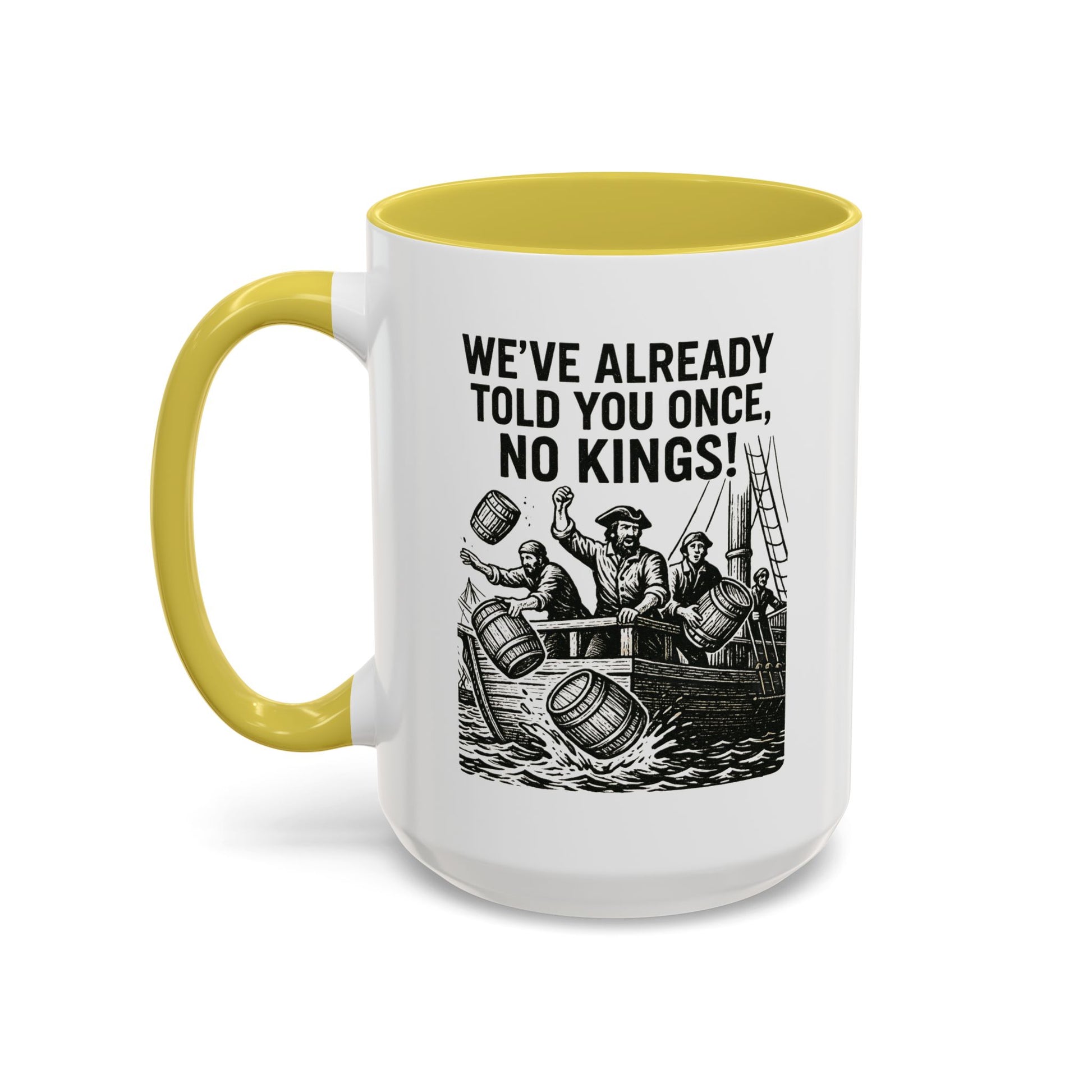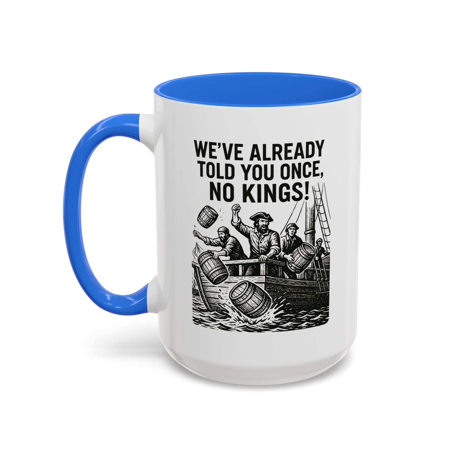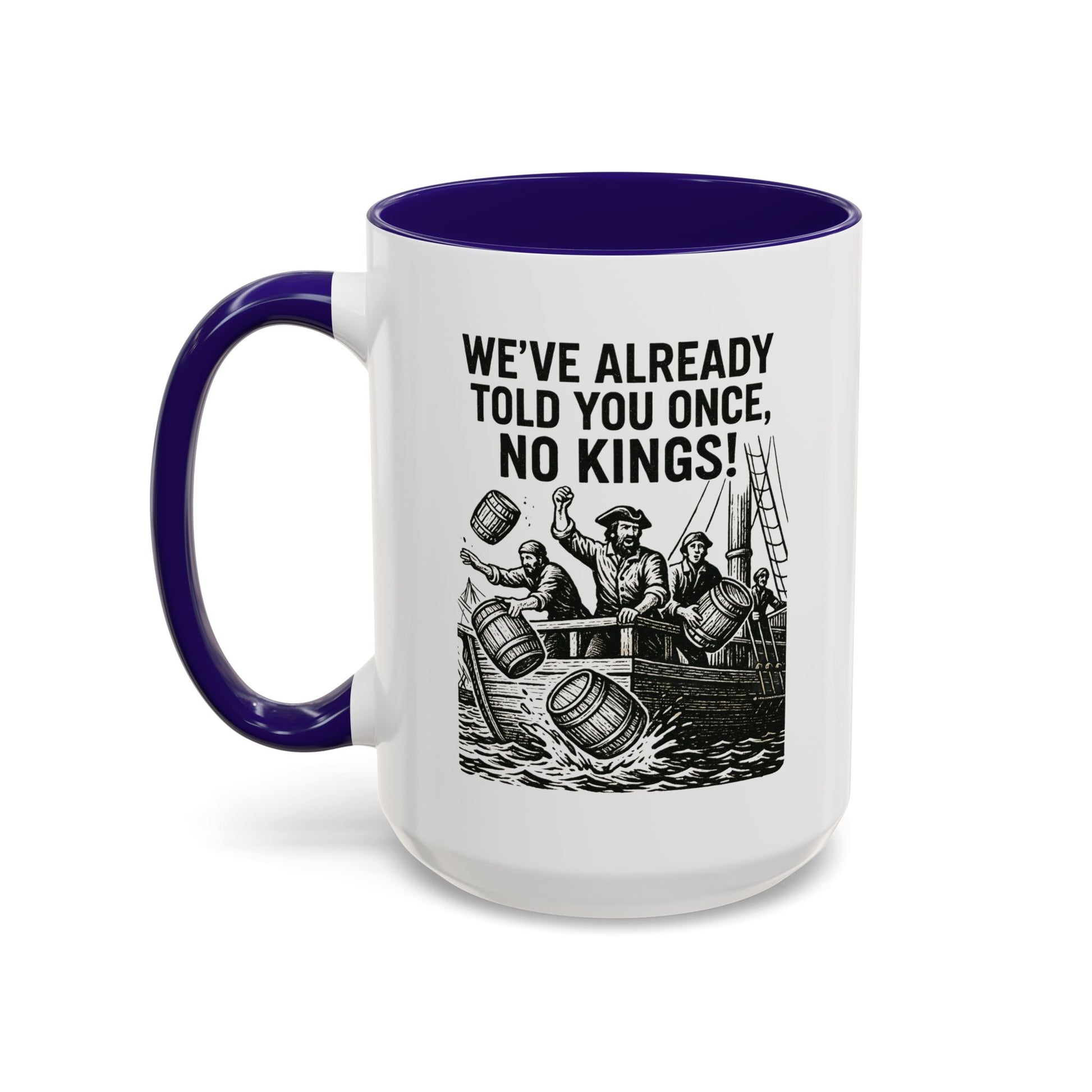Express your bold personality with this colorful mug featuring the phrase 'We’ve already told you once, no Kings'. Perfect for coffee lovers who enjoy a touch of humor in their daily routine. Ideal for gifting on birthdays, Father's Day, or as a fun office gift.