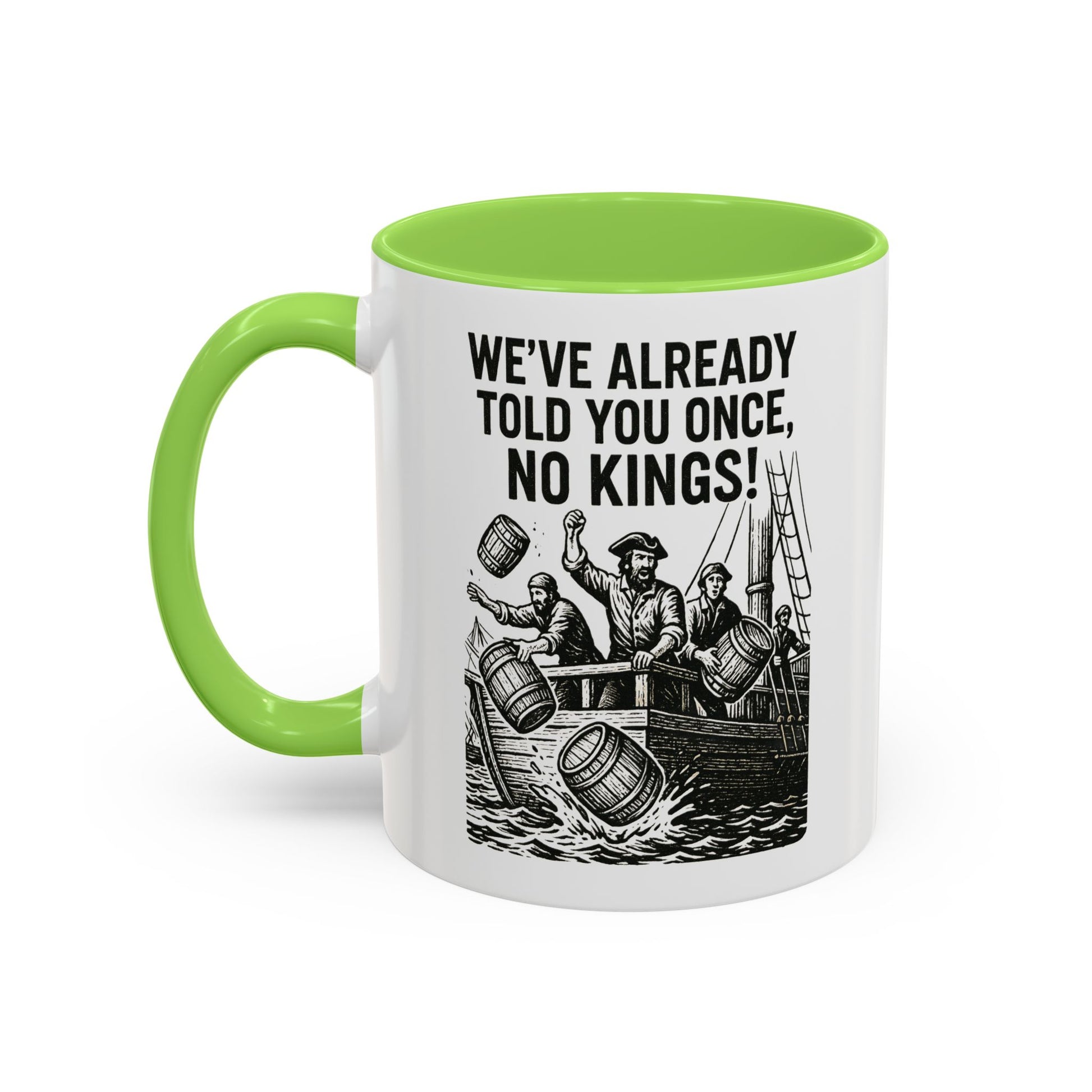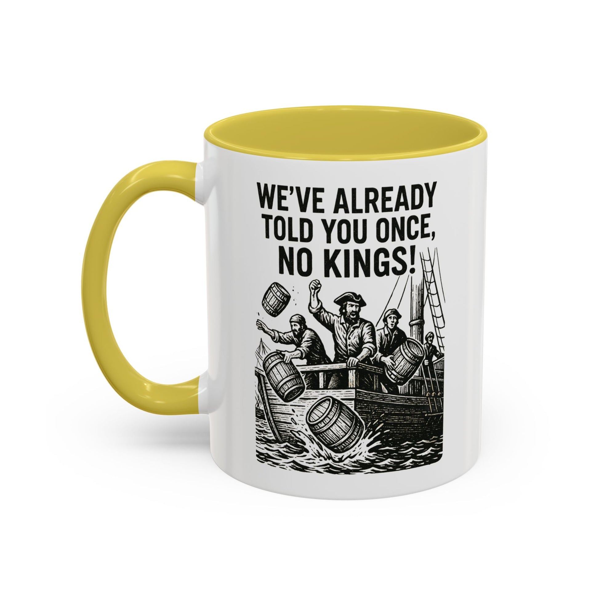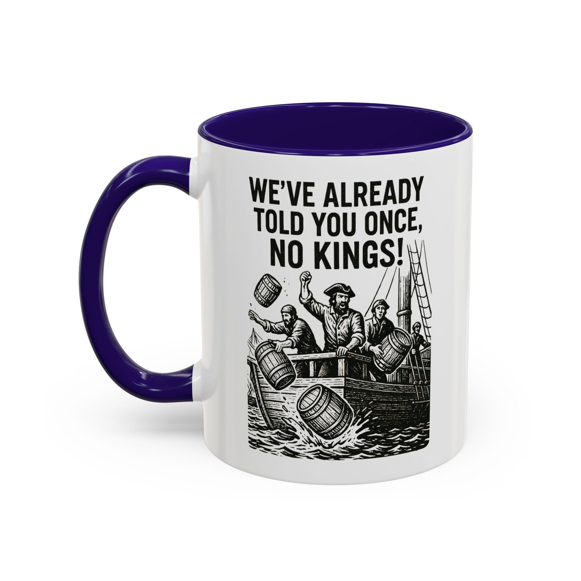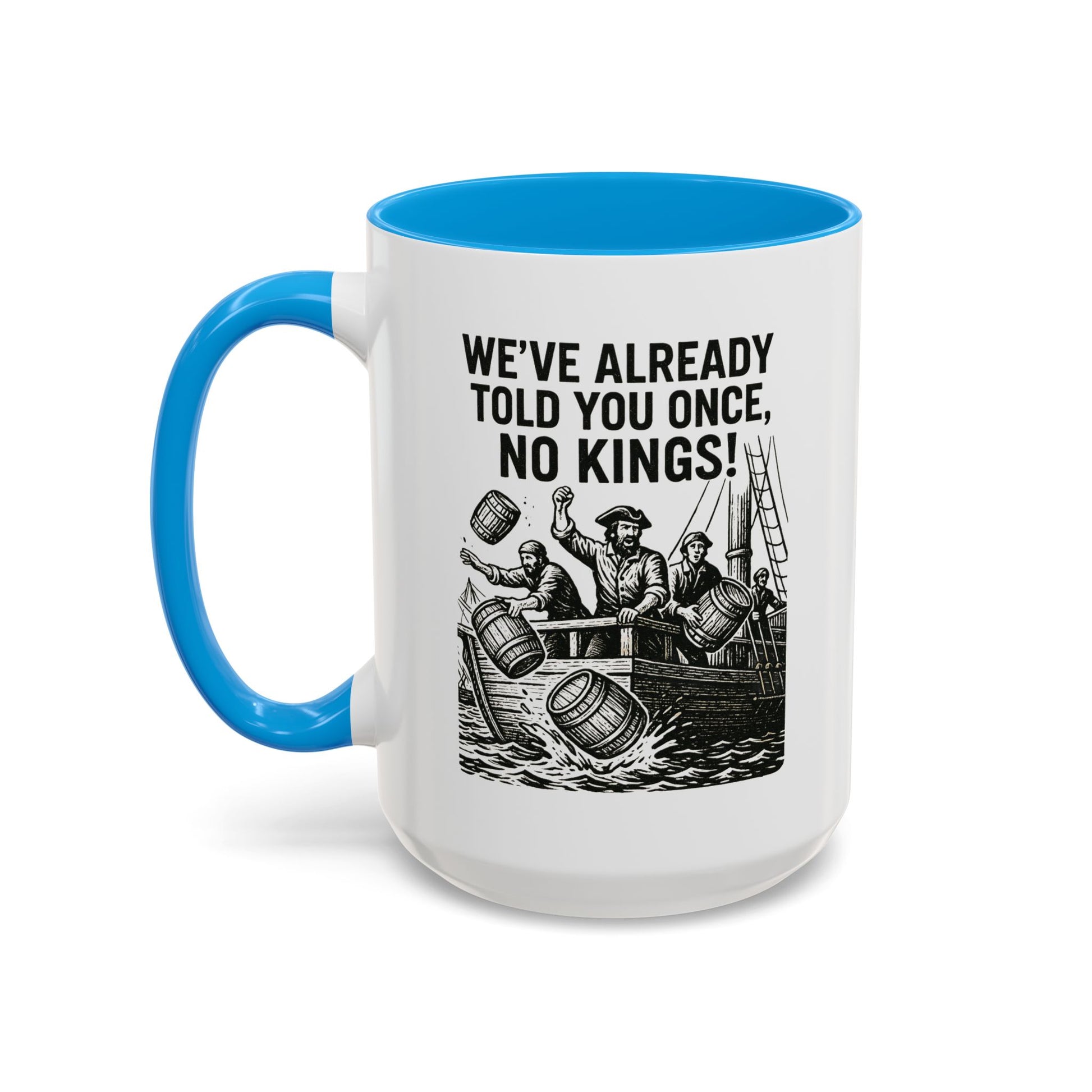Express your bold personality with this colorful mug featuring the phrase 'We’ve already told you once, no Kings'. Perfect for coffee lovers who enjoy a touch of humor in their daily routine. Ideal for gifting on birthdays, Father's Day, or as a fun office gift.