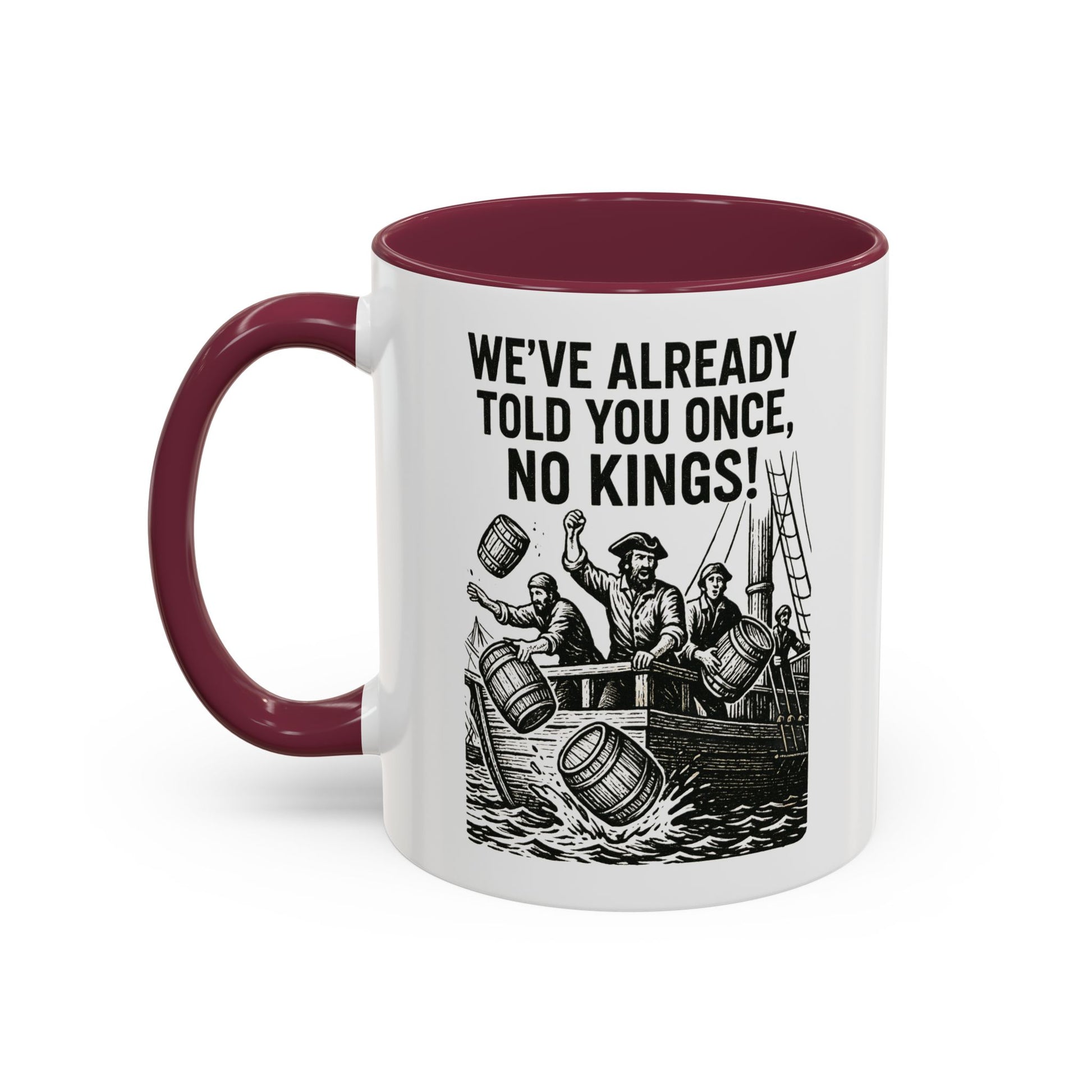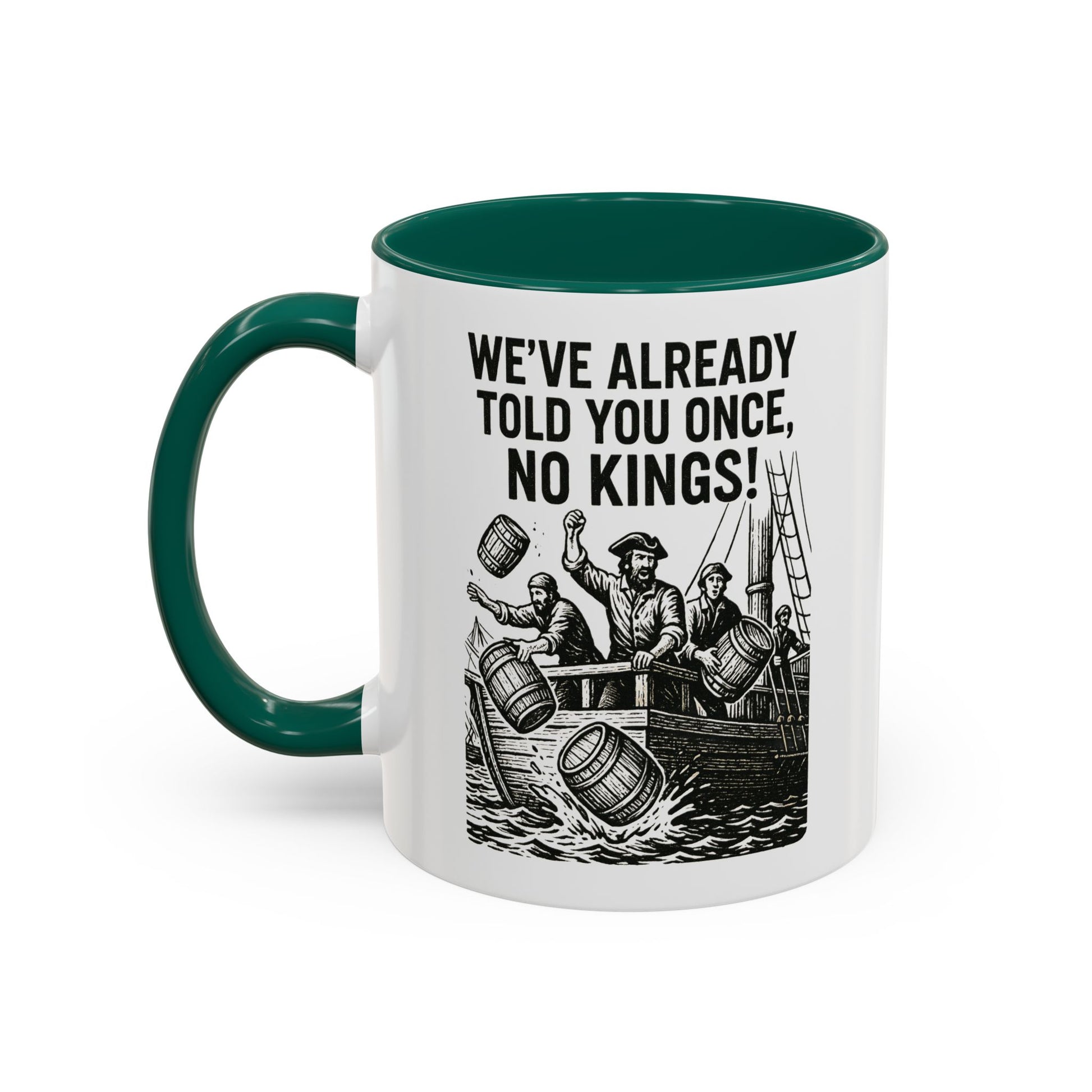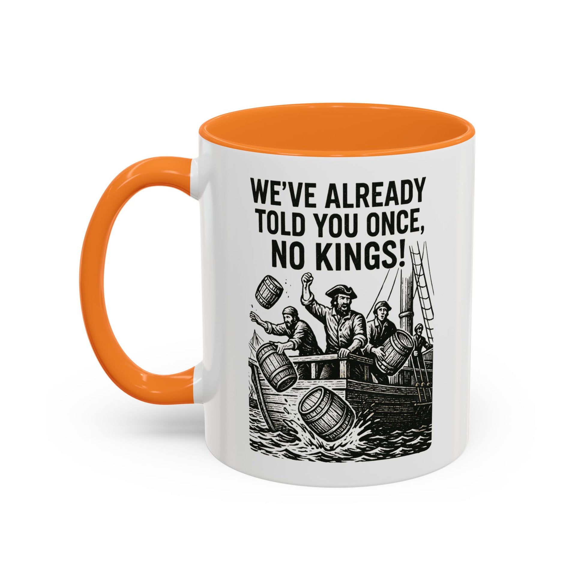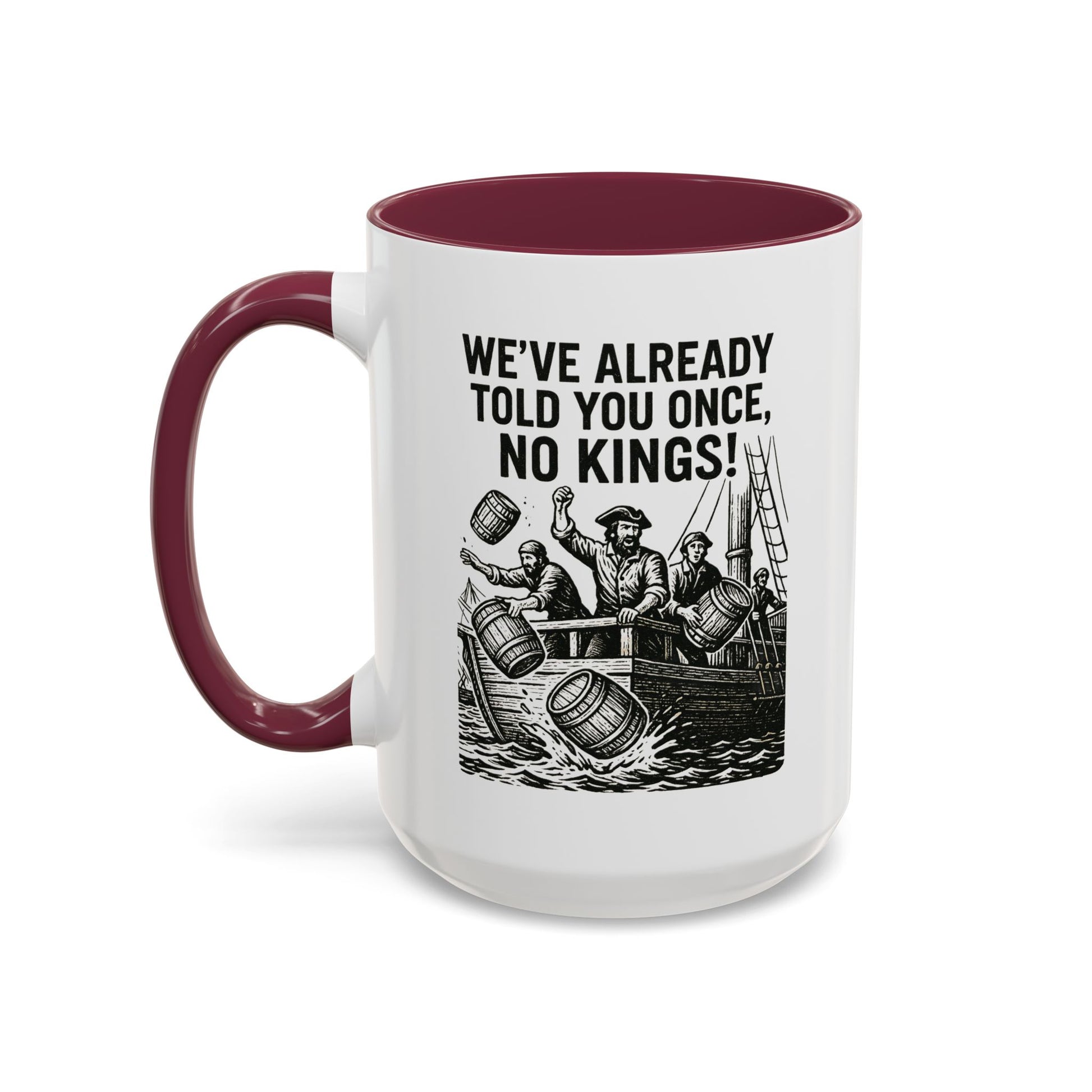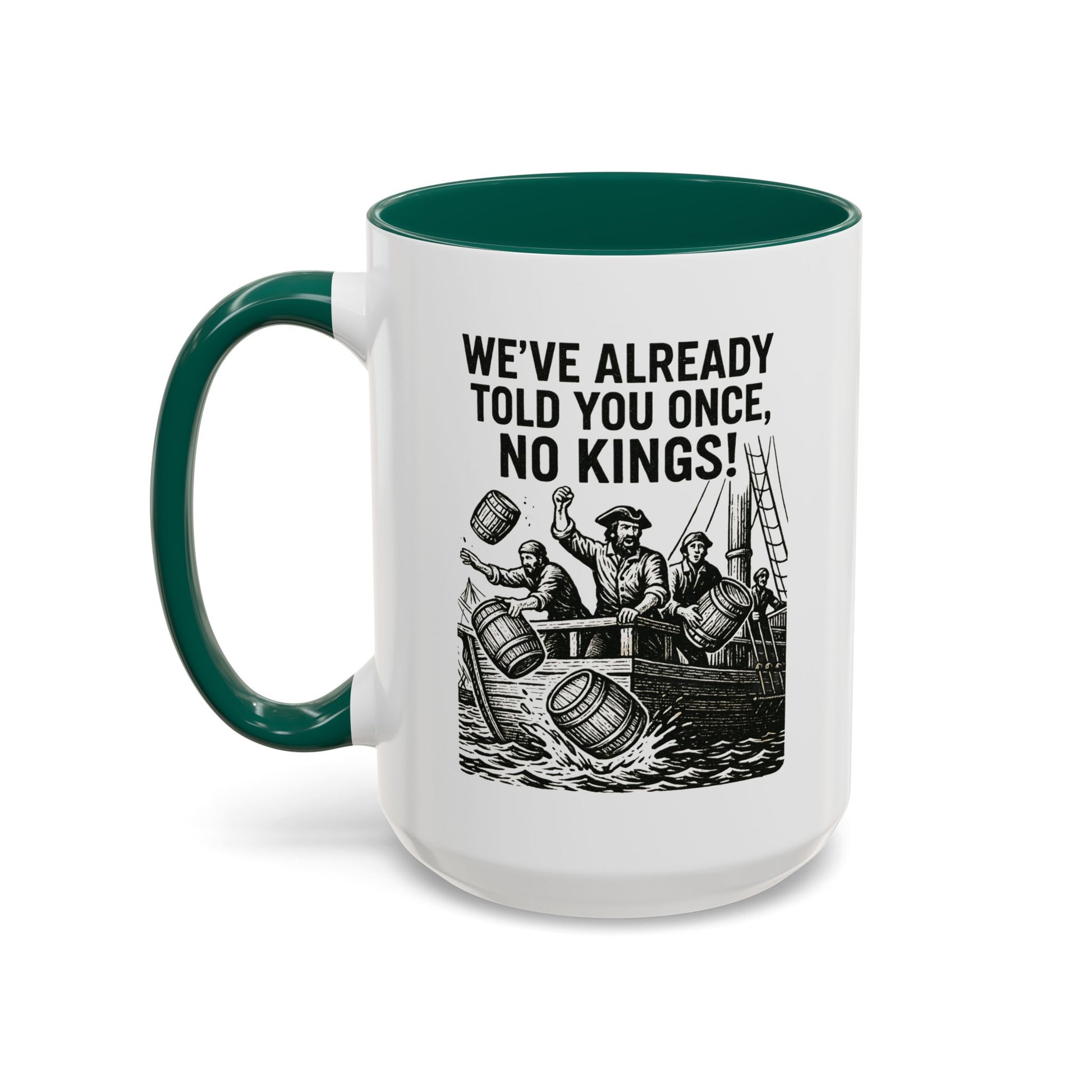 Express your bold personality with this colorful mug featuring the phrase 'We’ve already told you once, no Kings'. Perfect for coffee lovers who enjoy a touch of humor in their daily routine. Ideal for gifting on birthdays, Father's Day, or as a fun office gift.