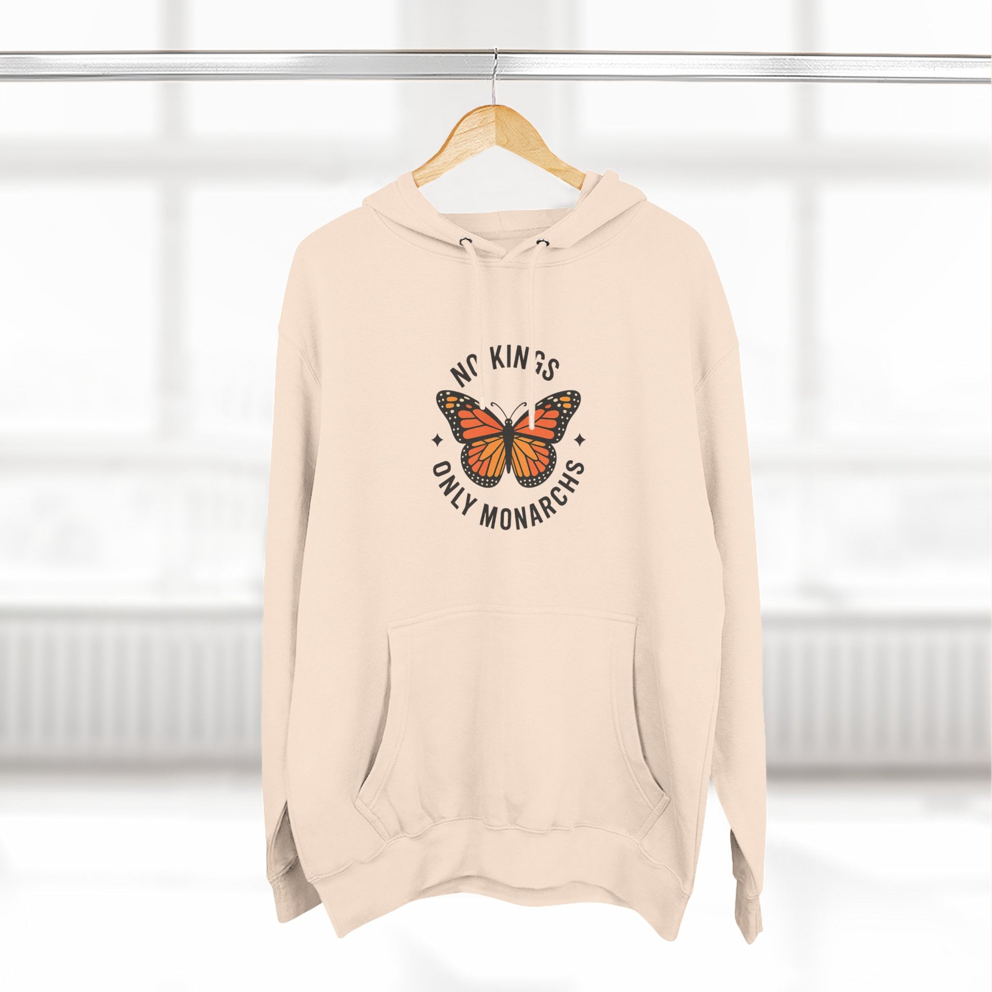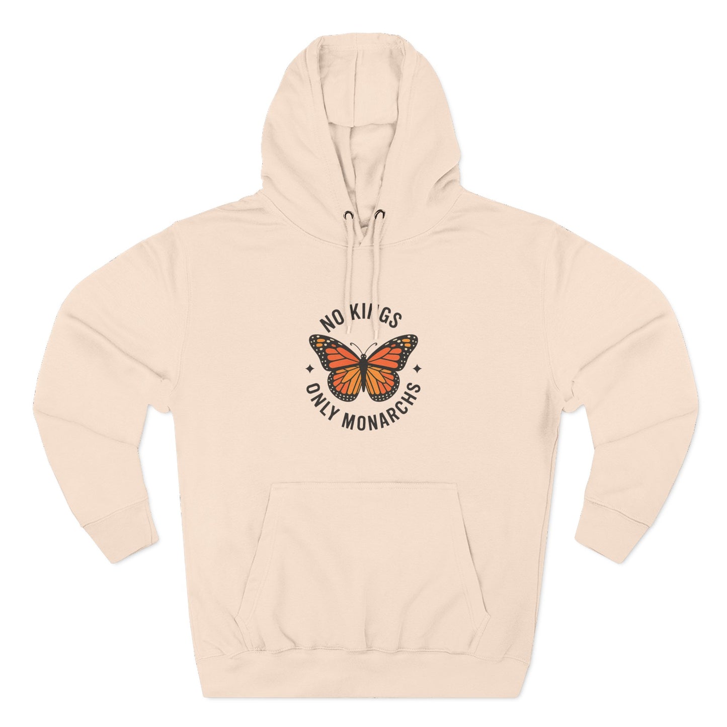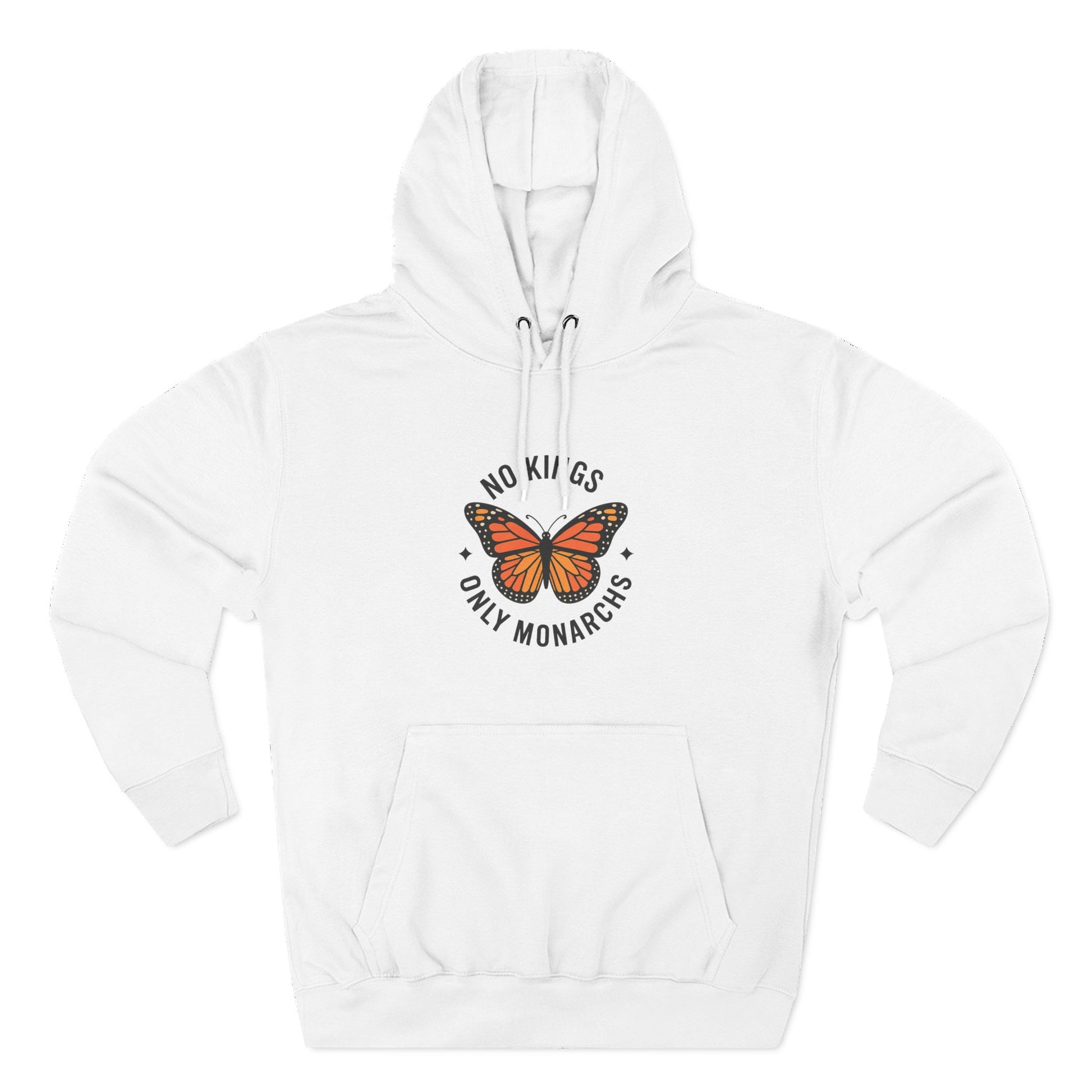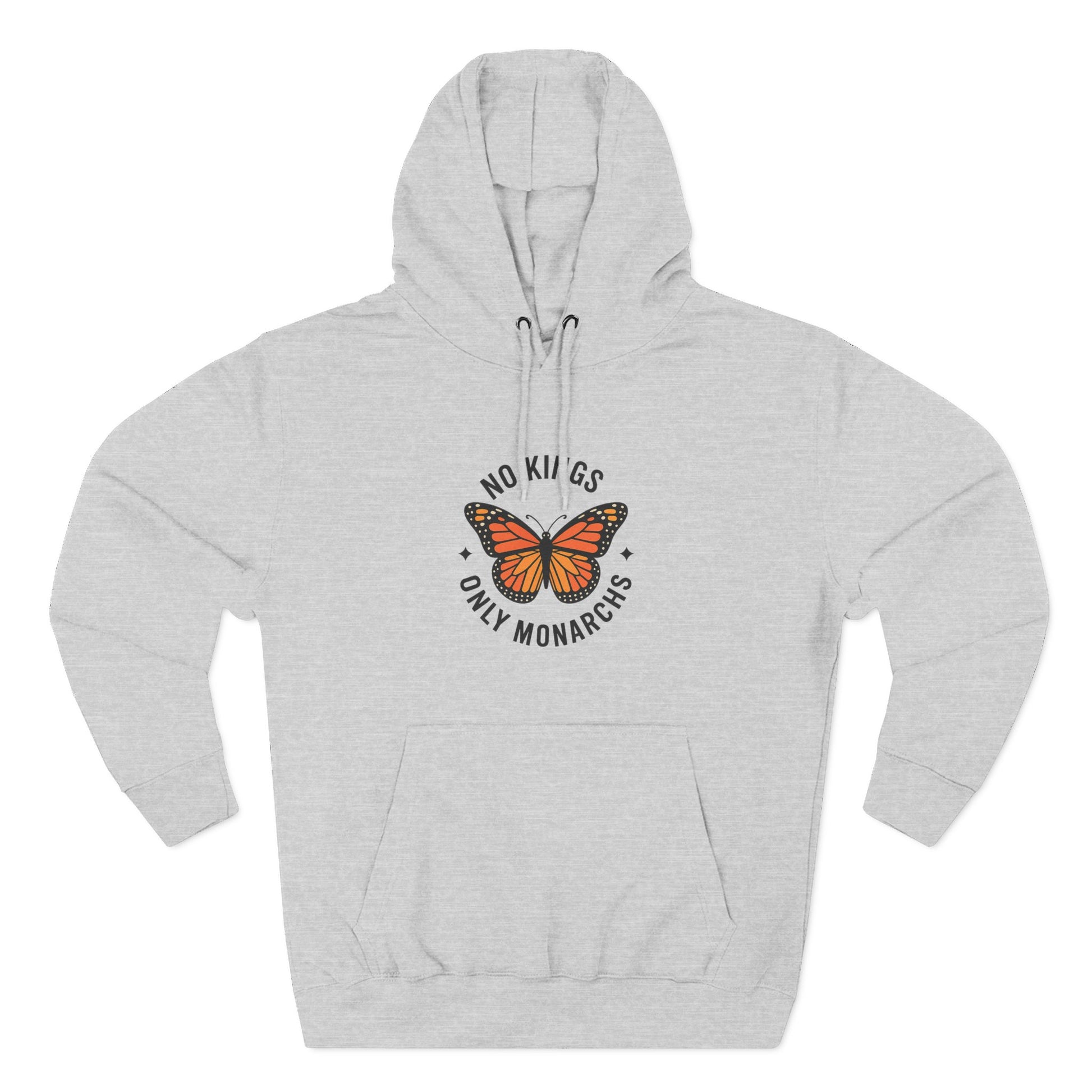 This Three-Panel Fleece Hoodie featuring the 'No Kings Only Monarchs' design is perfect for activists and nature lovers. It has a soft hand-feel and a spacious kangaroo pouch pocket to keep your hands warm. This hoodie is ideal for those who value comfort and style, and it is relevant for occasions like Earth Day and protests.