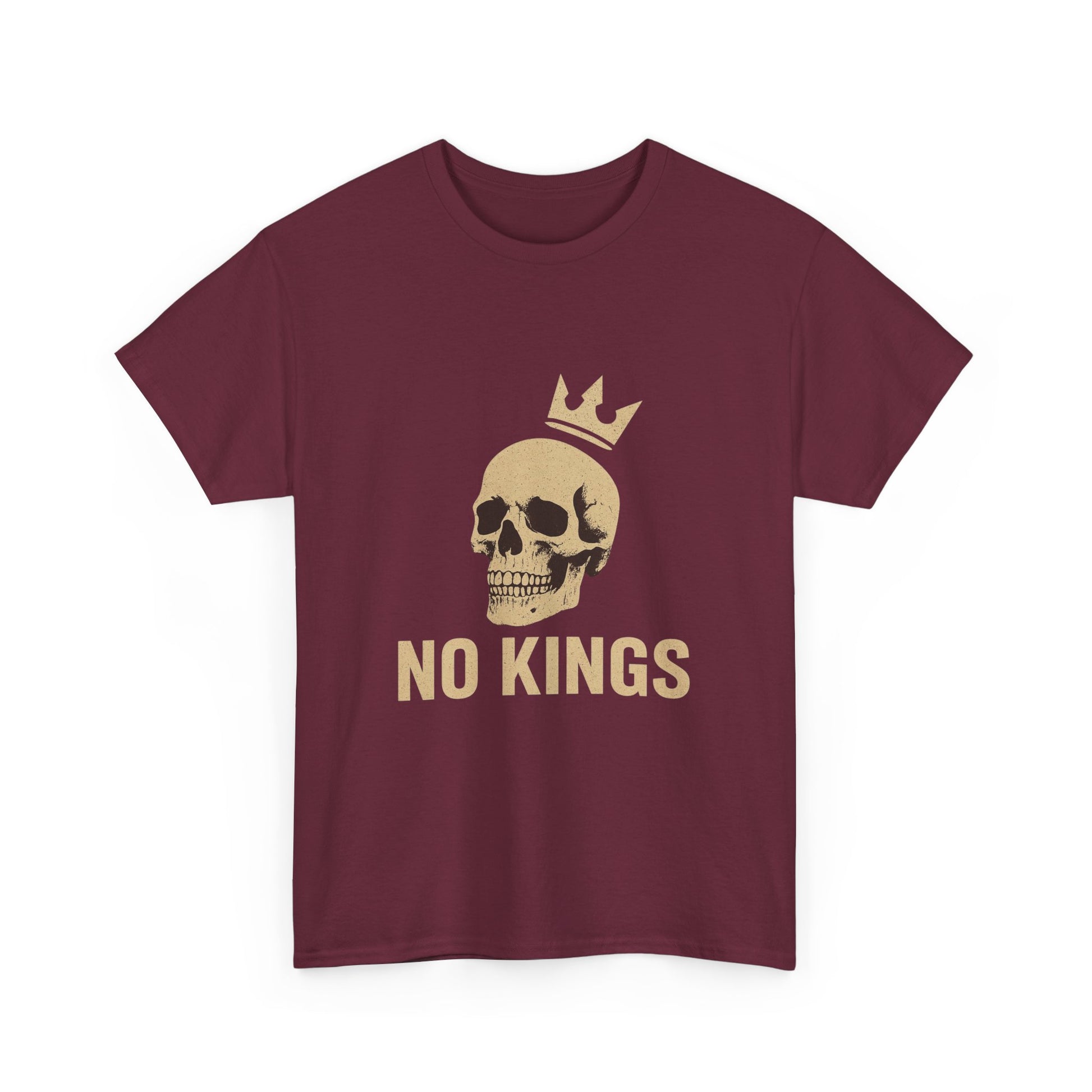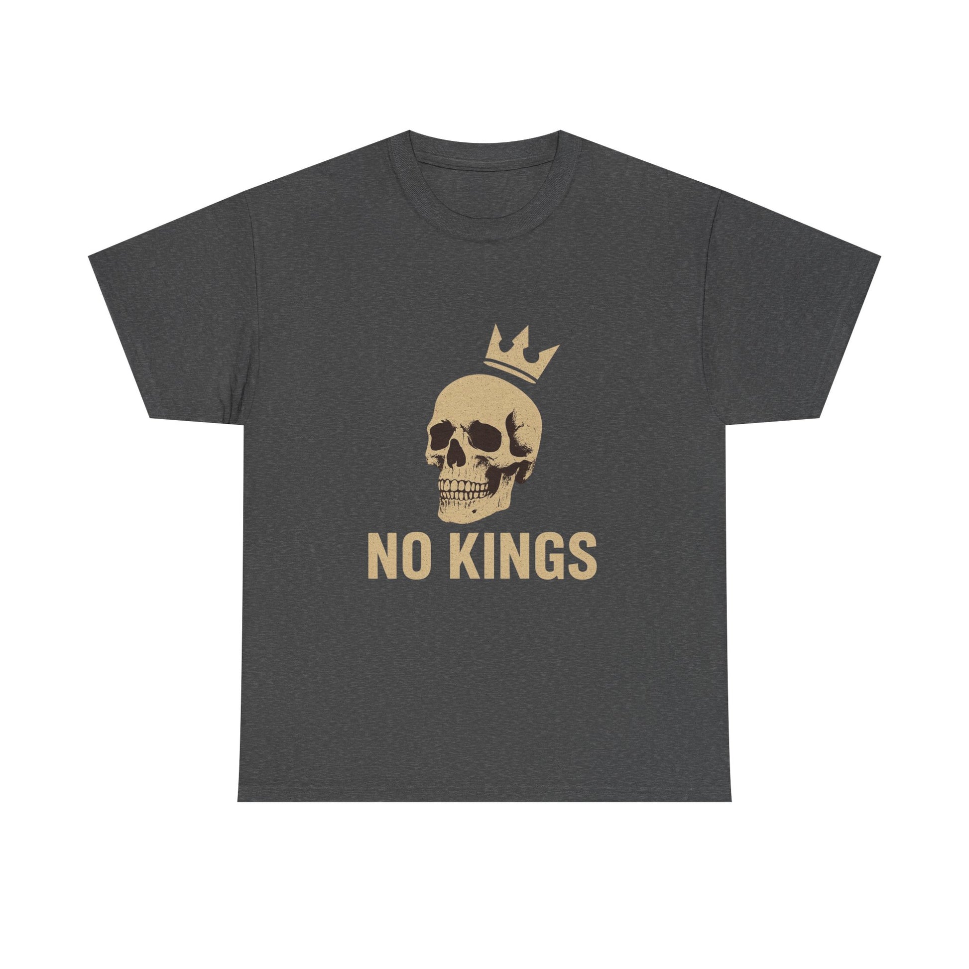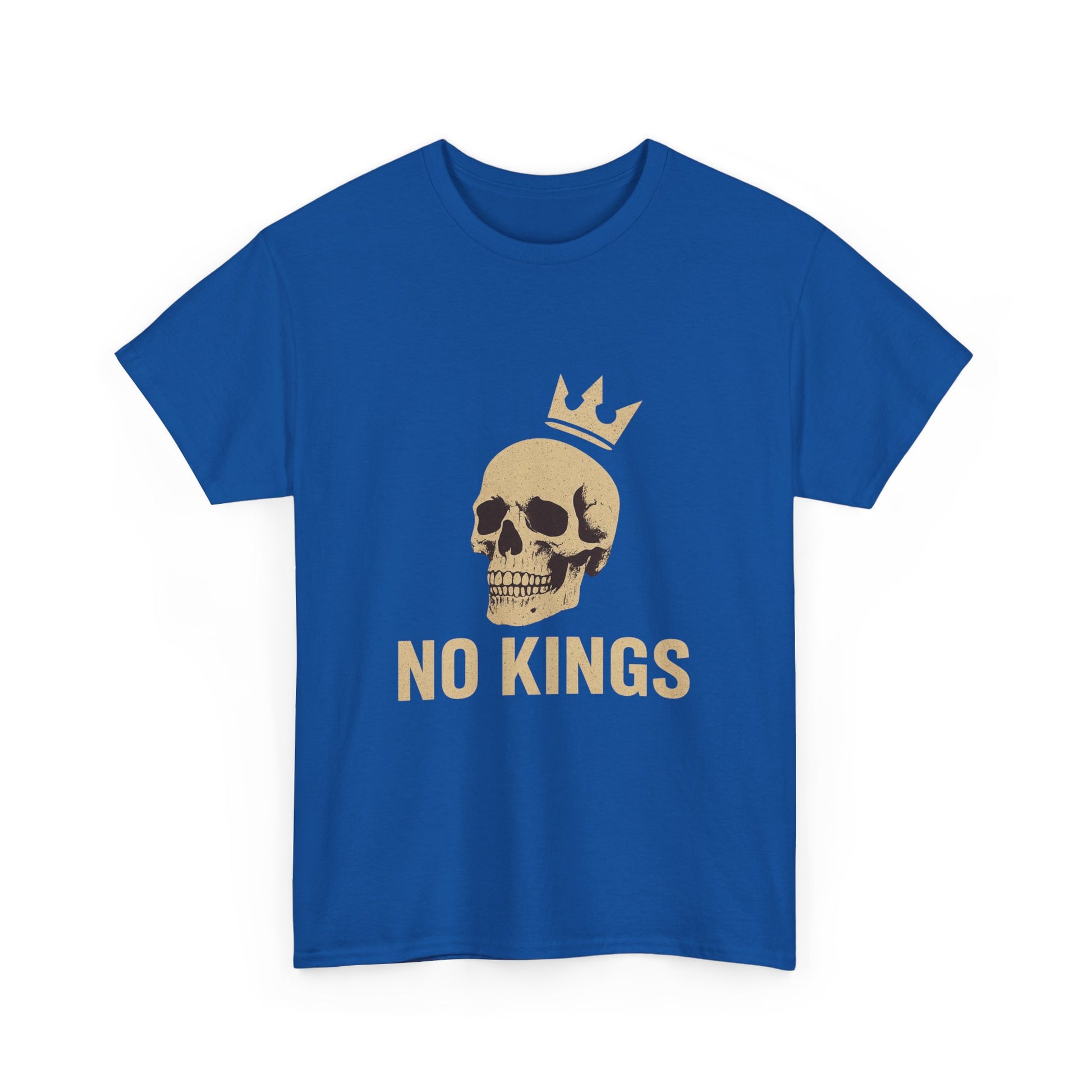 This 'No kings' tee exudes a rebellious and edgy vibe, perfect for individuals who want to make a statement with their clothing. It can be worn by adults who appreciate strong and smooth fabric, ideal for printing. Suitable for casual wear or to showcase a bold style during events like protests or social gatherings.
