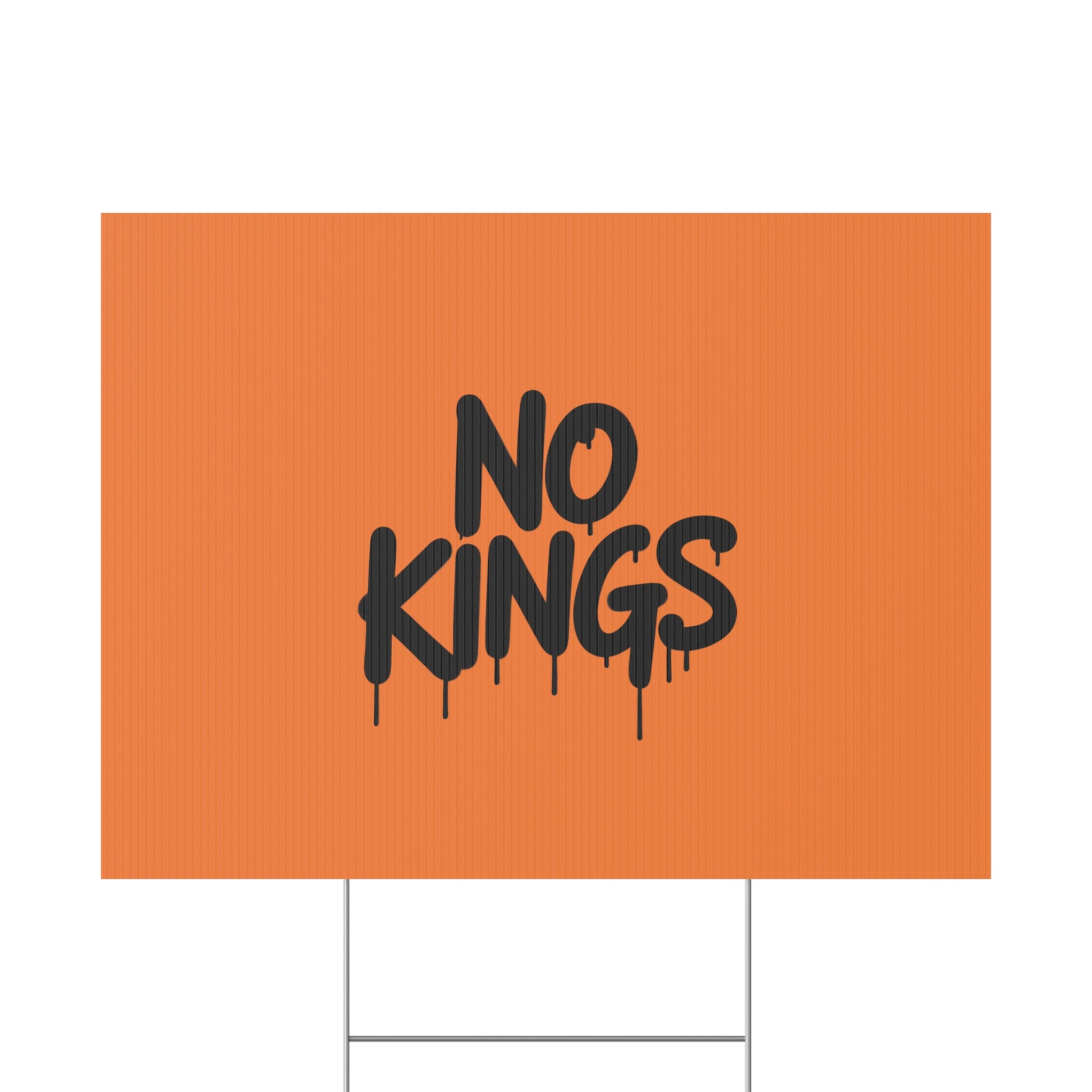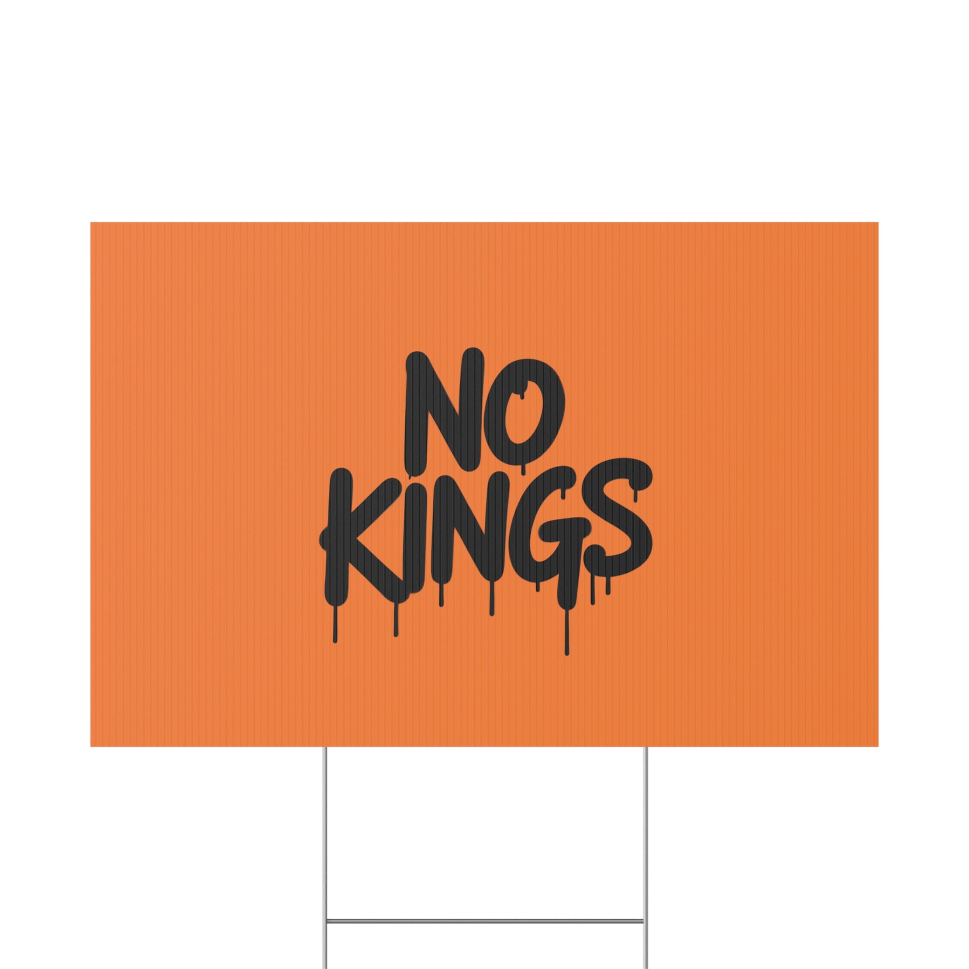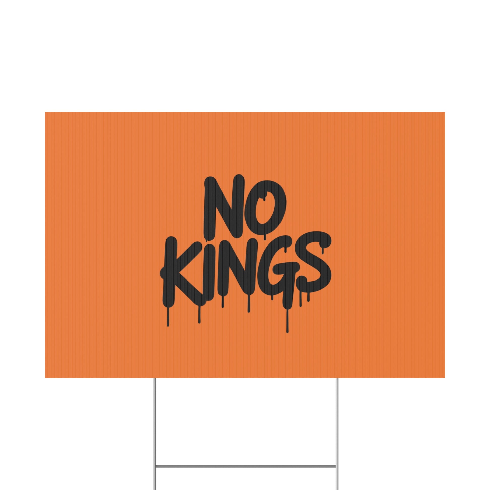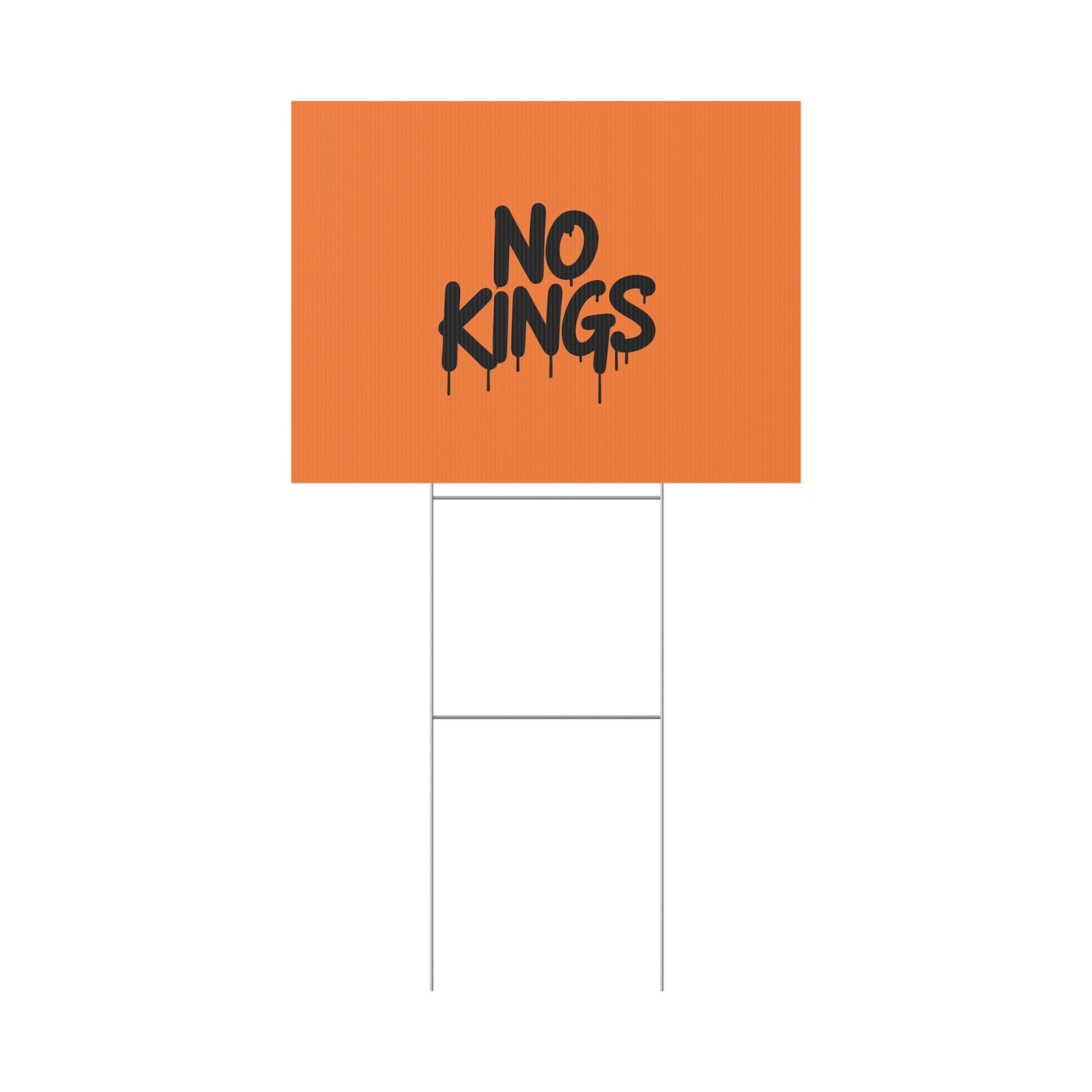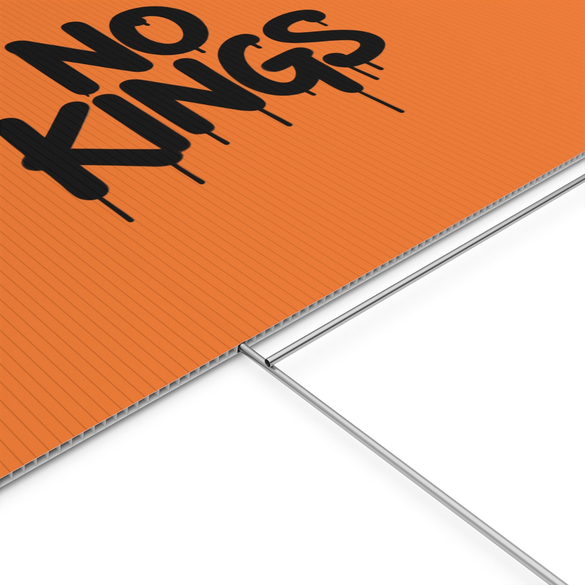 A protest yard sign with a spray painted 'No Kings' design, perfect for making a statement in your outdoor space. Ideal for activists, protestors, and those passionate about social issues. Relevant for protests, demonstrations, and political awareness campaigns.